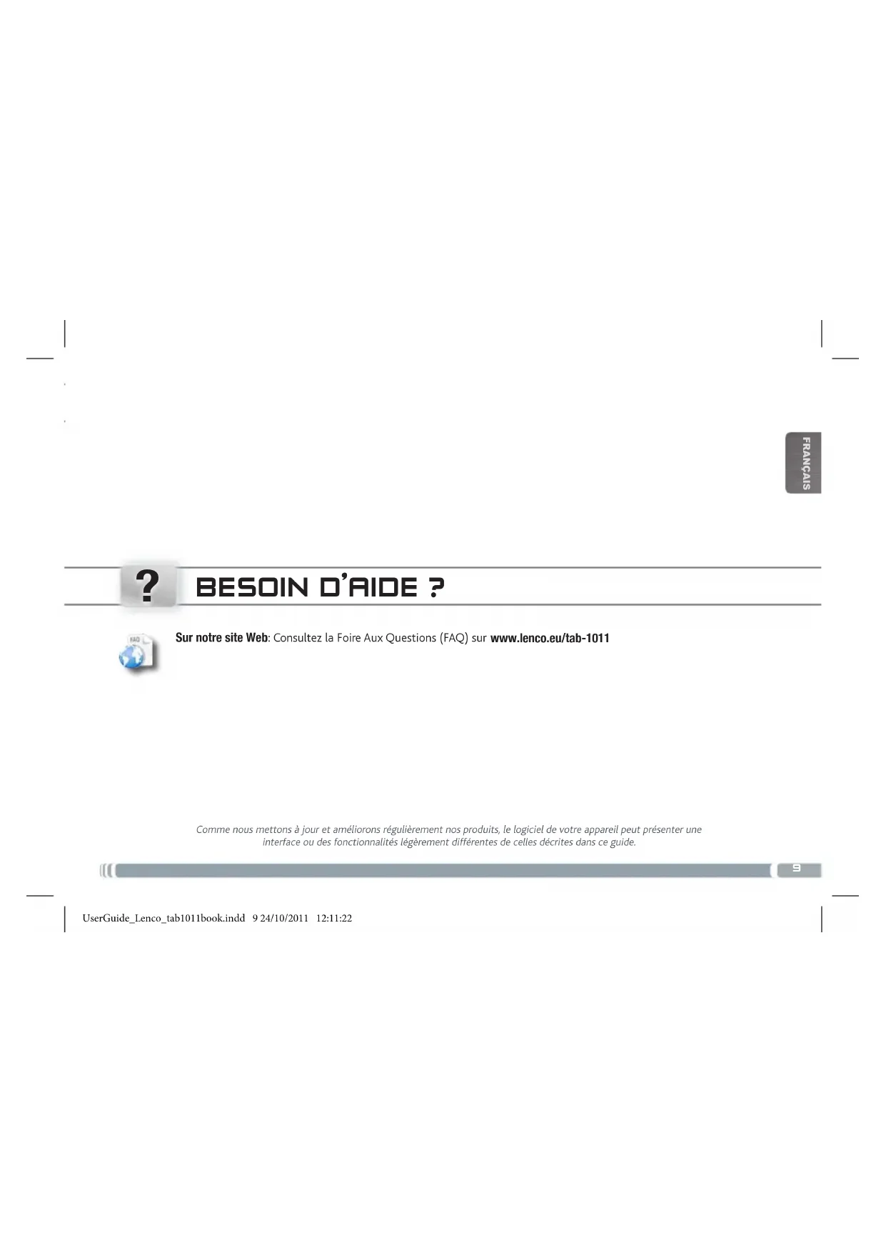Français traNsfErriNg mEDia to your tab-1011 bEsoiN D’aiDE ? Comme nous mettons à jour et améliorons régulièrement nos produits, le logiciel de votre appareil peut présenter une interface ou des fonctionnalités légèrement différentes de celles décrites dans ce guide. Sur notre site Web: Consultez la Foire Aux Questions (FAQ) sur www.lenco.eu/tab-1011 UserGuide_Lenco_tab1011book.indd 9 24/10/2011 12:11:2210