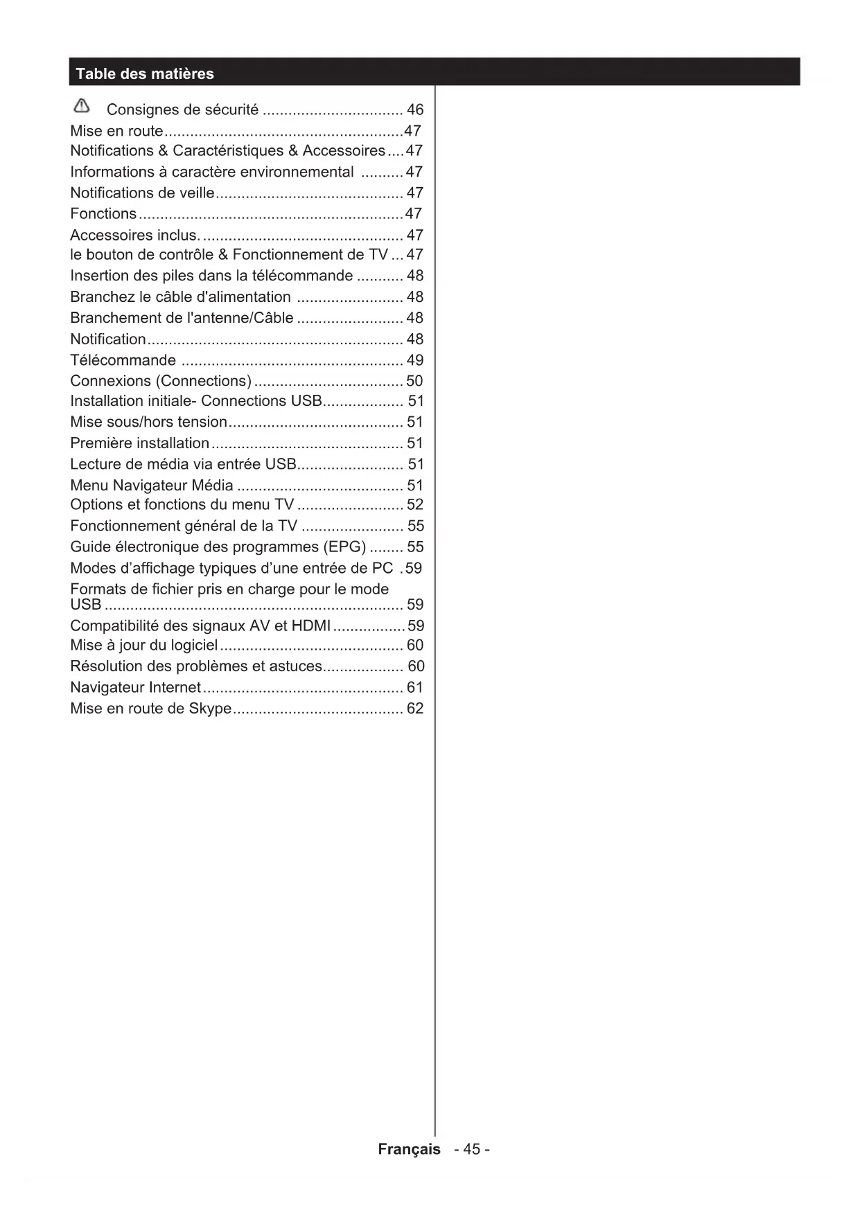 (X: Non disponible, O: Disponible) Dans certains cas, un signal sur l’écran du téléviseur LCD peut ne pas s’afcher correctement. Le problème peut être une incompatibilité avec les normes de l’équipement source (DVD, décodeur, etc.). Si vous rencontrez ce type de problème, veuillez contacter votre fournisseur et le fabricant de l’appareil source. Modesd’afchagetypiquesd’uneentréedePC Le tableau ci-après est une illustration de quelques modes d’afchage vidéo typiques. Votre téléviseur ne peut pas prendre en charge toutes les résolutions. Votre téléviseur prend en charge jusqu’à 1920x1080. Index Résolution Fréquence 1 640x350p 60 Hz 2 640x400p 60 Hz 3 1024x768 60 Hz 4 1280x768 60 Hz 5 1360x768 60 Hz 6 720x400 60 Hz 7 800x600 56 Hz 8 800x600 60 Hz 9 1024x768 60 Hz 10 1024x768 66 Hz 11 1280x768 60 Hz 12 1360x768 60 Hz 13 1280x1024 60 Hz 14 1280x960 60 Hz 15 1280x1024 60 Hz 16 1400x1050 60 Hz 17 1600x1200 60 Hz 18 1920x1080 60 HzFrançais - 60 - Mise à jour du logiciel Votre TV peut grâce à l'antenne ou au câble ou Internet rechercher et effectuer les mises à jour automatiques. Recherche de mise à jour de logiciels à travers l’interface utilisateur Parcourrez simplement le menu principal. Sélectionner Réglages et choisissez le menu Autres réglages . Dans le menu Autres paramètres , sélectionnez l’élément Mise à jour de logiciel et appuyez sur le bouton OK pour ouvrir le menu Options de mise à jour Remarque: Une connexion Internet est nécessaire. En cas d'échec de connexion Internet, essayez une mise à jour via la diffusion. Si une mise à jour est disponible, il commence à la télécharger. Appuyez sur OK pour poursuivre l’opération de redémarrage. 3 Recherche et mode de mise à jour Lorsque la TV reçoit le signal de l'antenne. Si l’option Recherche automatique du menu Options de mise à jour est activée, la TV se met automatiquement en marche à 03:00 et lance la recherche de chaînes de diffusion pour la mise à jour du nouveau logiciel. Si un nouveau logiciel est trouvé et téléchargé avec succès, le téléviseur commence à fonctionner avec la nouvelle version du logiciel au prochain démarrage. Remarque : Si la TV ne s'allume pas après la mise à jour, débranchez-la pour 2 minutes avant de la débrancher. Résolution des problèmes et astuces La TV va s'allumer Assurez-vous que le câble d’alimentation est correctement branché dans la prise murale. Les piles qui se trouvent dans la télécommande peuvent être déchargées. Appuyez sur la touche de mise en marche du téléviseur Mauvaise qualité d’image