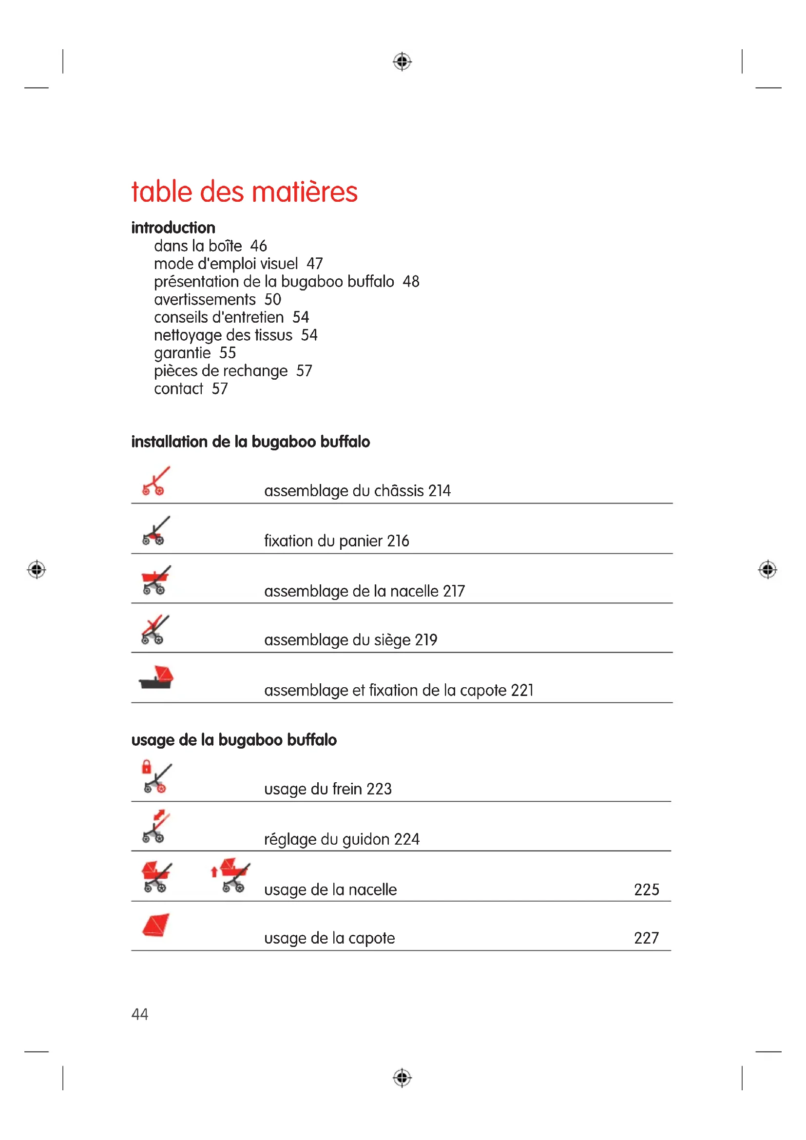 TRtable des matières introduction dans la boîte 46 mode d'emploi visuel 47 présentation de la bugaboo buffalo 48 avertissements 50 conseils d'entretien 54 nettoyage des tissus 54 garantie 55 pièces de rechange 57 contact 57 installation de la bugaboo buffalo assemblage du châssis 214 fixation du panier 216 assemblage de la nacelle 217 assemblage du siège 219 assemblage et fixation de la capote 221 usage de la bugaboo buffalo usage du frein 223 réglage du guidon 224 usage de la nacelle 225 usage de la capote 227 44usage du siège 228 usage du harnais 231 usage de la poignée 232 usage d'un sac sur le guidon 233 pliage en un seul élément avec nacelle face parents 234 pliage en un seul élément avec siège face parents 236 pliage en un seul élément avec siège face au monde 238 dépliage en un seul élément 240 pliage du châssis 241 pliage de la nacelle 242 usage de la dragonne de poignet 244 blocage/déblocage des roues pivotantes pour tout-terrain 245 usage de la position deux roues pour le sable et la neige 246 retrait des roues 248 usage de la protection pluie 249
