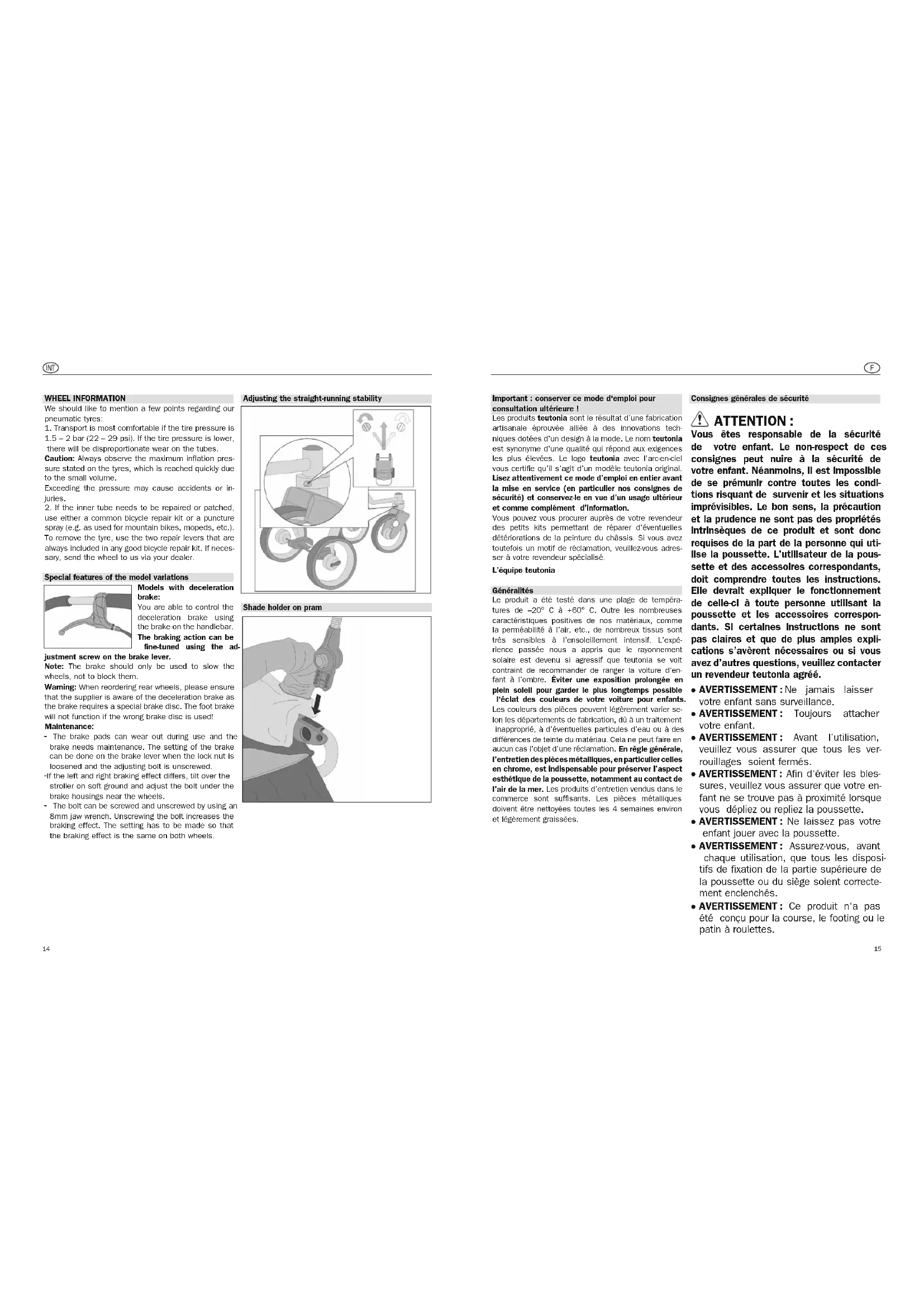 that the supplier is aware of the deceleration brake as the brake requires a special brake disc. The foot brake will not function if the wrong brake disc is used! Maintenance: - The brake pads can wear out during use and the brake needs maintenance. The setting of the brake can be done on the brake lever when the lock nut is loosened and the adjusting bolt is unscrewed. - If the left and right braking effect differs, tilt over the stroller on soft ground and adjust the bolt under the brake housings near the wheels. - The bolt can be screwed and unscrewed by using an 8mm jaw wrench. Unscrewing the bolt increases the braking effect. The setting has to be made so that the braking effect is the same on both wheels. Adjusting the straight-running stability Shade holder on pram 14● AVERTISSEMENT : Toute charge fixée à la poignée, à l‘arrière du siège ou sur les côtés de la poussette ou du landau nuit à la stabilité du produit. Autres consignes de sécurité ● teutonia ne garantit pas la sécurité du produit en cas d‘utilisation d‘accessoires et de pièces détachées que teutonia n‘aurait pas produits ni agréés. En cas d‘utilisation de tels accessoires et pièces détachées, la garantie prendrait fin immé- diatement. ● Cette poussette est prévue uniquement pour un enfant. ● L‘unité de siège ou la nacelle ne doivent pas être utilisées dans une voiture. ● Le siège de la poussette est conçu pour al.ler de la naissance jusqu‘à 15 kg. ● Les nacelles ou les landaus et les pous- settes ne doivent être utilisés que pour le transport et ne peuvent en aucun cas remplacer un lit ou un berceau. ● Toujours garer la poussette hors de la portée des enfants et ne les autorisez pas à jouer avec ou dans celle-ci. ● Assurez-vous de ne jamais stationner la poussette sans avoir préalablement blo- qué le frein. Assurez-vous également que le frein soit bien enclenché. ● Les freins doivent toujours être serrés lorsque vous enlevez votre enfant de la poussette ou que vous l‘installer dedans. ● Vous devez toujours éviter de garer la poussette en pente. ● Veillez particulièrement à bien stabiliser la poussette lorsque vous prenez les transports en commun. ● Faîtes rouler la poussette lentement et en douceur lorsque vous montez ou descen- dez les marches d‘escaliers. ● Ne jamais poser d’objets sur la capote. ● La charge maximale du filet à provisions est de 5 kg (11 lb). Toujours placer les objets lourds au centre du panier à pro- visions. ● Veillez à ne pas vous blesser ou blesser quelqu‘un d‘autre, lorsque vous pliez ou dépliez le châssis. ● Lorsque vous portez la poussette au-des- sus d’obstacles (escaliers, p. ex.), veillez à ce qu’aucun des dispositifs de blocage ne soit déverrouillé. ● Lorsque vous effectuez les réglages, veil- lez à ce que votre enfant ne se trouve pas à proximité des pièces mobiles. ● Une charge trop lourde, un pliage incor- rect ou l’utilisation d’accessoires non autorisés par le fabricant peuvent détério- rer ou endom mager la poussette. ● Le repose-pied ne doit pas être utilisé pour transporter des charges ou un deu- xième enfant. ● Avant la première utilisation de la pous- sette : veuillez ôter les autocollants et étiquettes ne se rapportant PAS à des consignes de sécurité. ● Ne jamais utiliser le repose-pieds ou l’arceau de protection pour soulever et/ ou porter la poussette. ● Jusqu‘à 6 mois, il est conseillé de tou- jours placer le dossier dans la position la plus basse. Arrêt de la voiture Attention: le pneu peut parfois décollorer le revête- ment de sol. Les corps étrangers (p.ex. les petites pierres) dans les roues doivent être enlevés afin d’éviter un eventuel endommagement des revêtements de sol. Une cha- leur intense, en particulier le contact direct avec des surfaces très chaudes (par ex. en été dans la voiture) peut entraîner des déformations permanentes des pneus mi-pleins. Les réclamations et/ou recours relatifs à cela ne seront pas admis. Nettoyage des parties en tissu Pour les petites taches, nettoyez précautionneuse- ment les endroits concernés avec un chiffon humide et de l’eau claire. Évitez de frotter trop fortement (en particulier pour les tissus sombres). Normalement vous pouvez laver en machine à 30°C (programme pour textiles délicats) toutes les parties amovibles en tissu avec une lessive pour textiles délicats (sans agent blanchissant optique). Voyez instruction d’entre- tien fixée à la partie de tissu. Pèlerine anti-pluie En cas de pluie, étendre à temps la pèlerine anti-pluie sur toute la voiture d’enfant. Attention: la pèlerine anti-pluie n’est pas un jouet ! Ne laissez jamais votre enfant sans surveillance. Pour une aération optimale de la voiture d’enfant, nous recom- mandons d’étendre la pèlerine anti-pluie seulement durant l’averse. Retrait du couvre-capote Avant le lavage, les deux arceaux doivent être enlevés de l’enveloppe. (voir esquisse) Desserrer la vis à l’aide d’un tournevis et enlever le bouton-poussoir. Enlever maintenant les arceaux de la jointure et du couvre-capote. Après le lavage monter dans l’ordre inverse. Ce faisant, veiller à ce que les arceaux soient glissés dans les deux guides décousus. Les arceaux avant et arrière ne doivent pas être intervertis. Montage du châssis Actionner la fixation de transport (4) et replier la pous- sette au niveau de son guidon réversible (5) jusqu’à ce qu’il s’encliquette de manière audible dans la posi- tion illustrée (6).