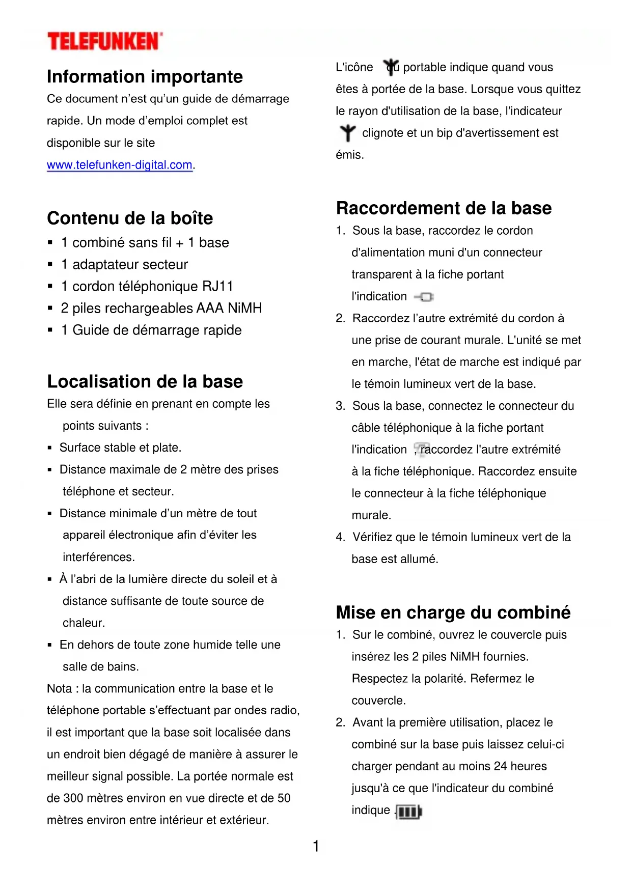 Information importante Ce document n’est qu’un guide de démarrage rapide. Un mode d’emploi complet est disponible sur le site www.telefunken-digital.com. Contenu de la boîte 1 combiné sans fil + 1 base 1 adaptateur secteur 1 cordon téléphonique RJ11 2 piles rechargeables AAA NiMH 1 Guide de démarrage rapide Localisation de la base Elle sera définie en prenant en compte les points suivants :