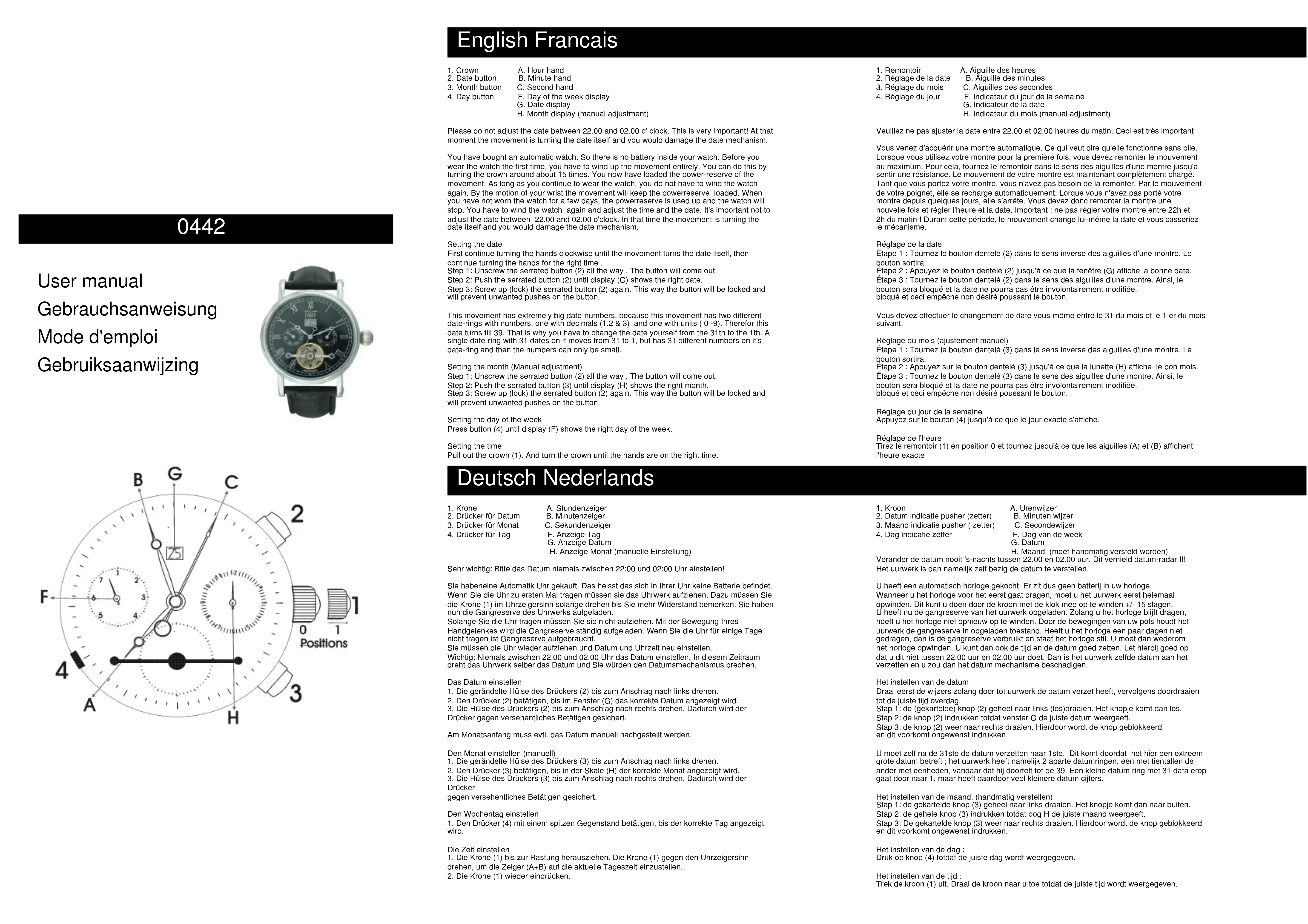 Téléchargez la notice de votre Montre au format PDF gratuitement ! Retrouvez votre notice 0442 - DAVIS et reprennez votre appareil électronique en main. Sur cette page sont publiés tous les documents nécessaires à l'utilisation de votre appareil 0442 de la marque DAVIS.
