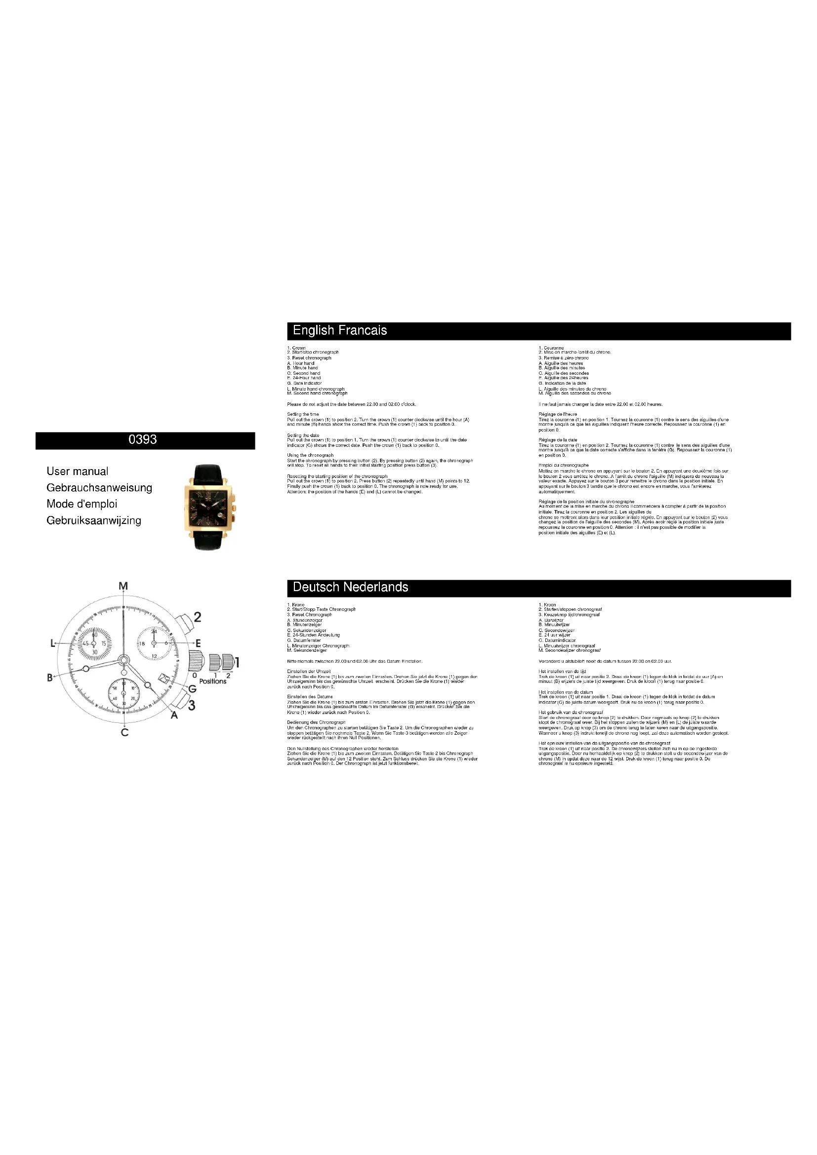 A. Aiguille des heures B. Aiguille des minutes C. Aiguille des secondes E. Aiguille des 24heures G. Indication de la date L. Aiguille des minutes du chrono M. Aiguille des secondes du chrono Il ne faut jamais changer la date entre 22.00 et 02.00 heures. Réglage de l'heure Tirez la couronne (1) en position 1. Tournez la couronne (1) contre le sens des aiguilles d'une montre jusqu'à ce que les aiguilles indiquent l'heure correcte. Repoussez la couronne (1) en position 0. Réglage de la date Tirez la couronne (1) en position 2. Tournez la couronne (1) contre le sens des aiguilles d'une montre jusqu'à ce que la date correcte s'affiche dans la fenêtre (G). Repoussez la couronne (1) en position 0. Emploi du chronographe Mettez en marche le chrono en appuyant sur le bouton 2. En appuyant une deuxième fois sur le bouton 2 vous arrêtez le chrono. A l'arrêt du chrono l'aiguille (M) indiquera de nouveau la valeur exacte. Appuyez sur le bouton 3 pour remettre le chrono dans la position initiale. En appuyant sur le bouton 3 tandis que le chrono est encore en marche, vous l'arrêterez automatiquement. Réglage de la position initiale du chronographe Au moment de la mise en marche du chrono il commencera à compter à partir de la position initiale. Tirez la couronne en position 2. Les aiguilles du chrono se mettront alors dans leur position initiale réglée. En appuyant sur le bouton (2) vous changez la position de l'aiguille des secondes (M). Après avoir réglé la position initiale juste repoussez la couronne en position 0. Attention : il n'est pas possible de modifier la position initiale des aiguilles (E) et (L).
