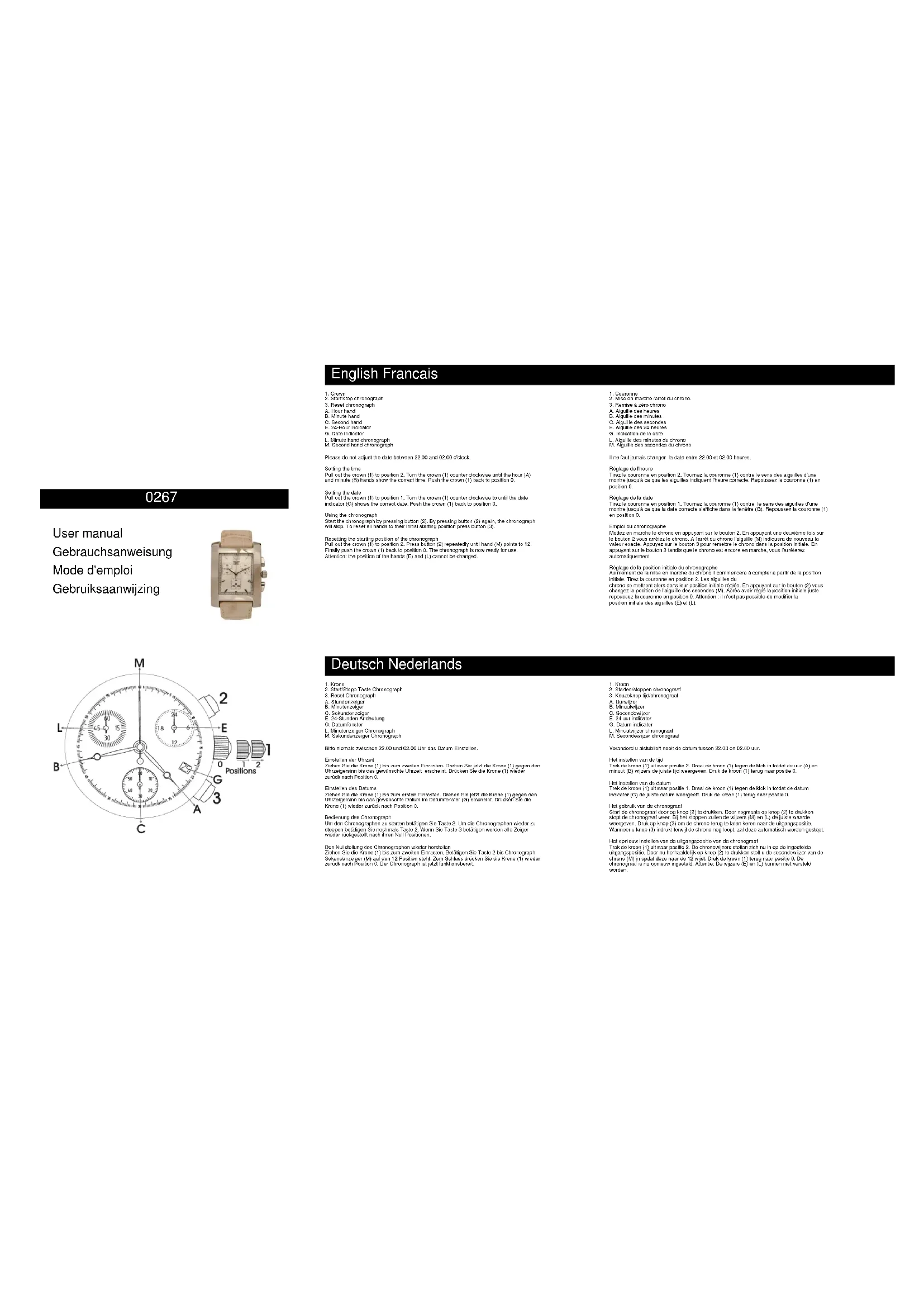 A. Aiguille des heures B. Aiguille des minutes C. Aiguille des secondes E. Aiguille des 24 heures G. Indication de la date L. Aiguille des minutes du chrono M. Aiguille des secondes du chrono Il ne faut jamais changer la date entre 22.00 et 02.00 heures. Réglage de l'heure Tirez la couronne en position 2. Tournez la couronne (1) contre le sens des aiguilles d'une montre jusqu'à ce que les aiguilles indiquent l'heure correcte. Repoussez la couronne (1) en position 0. Réglage de la date Tirez la couronne en position 1. Tournez la couronne (1) contre le sens des aiguilles d'une montre jusqu'à ce que la date correcte s'affiche dans la fenêtre (G). Repoussez la couronne (1) en position 0. Emploi du chronographe Mettez en marche le chrono en appuyant sur le bouton 2. En appuyant une deuxième fois sur le bouton 2 vous arrêtez le chrono. A l'arrêt du chrono l'aiguille (M) indiquera de nouveau la valeur exacte. Appuyez sur le bouton 3 pour remettre le chrono dans la position initiale. En appuyant sur le bouton 3 tandis que le chrono est encore en marche, vous l'arrêterez automatiquement. Réglage de la position initiale du chronographe Au moment de la mise en marche du chrono il commencera à compter à partir de la position initiale. Tirez la couronne en position 2. Les aiguilles du chrono se mettront alors dans leur position initiale réglée. En appuyant sur le bouton (2) vous changez la position de l'aiguille des secondes (M). Après avoir réglé la position initiale juste repoussez la couronne en position 0. Attention : il n'est pas possible de modifier la position initiale des aiguilles (E) et (L).