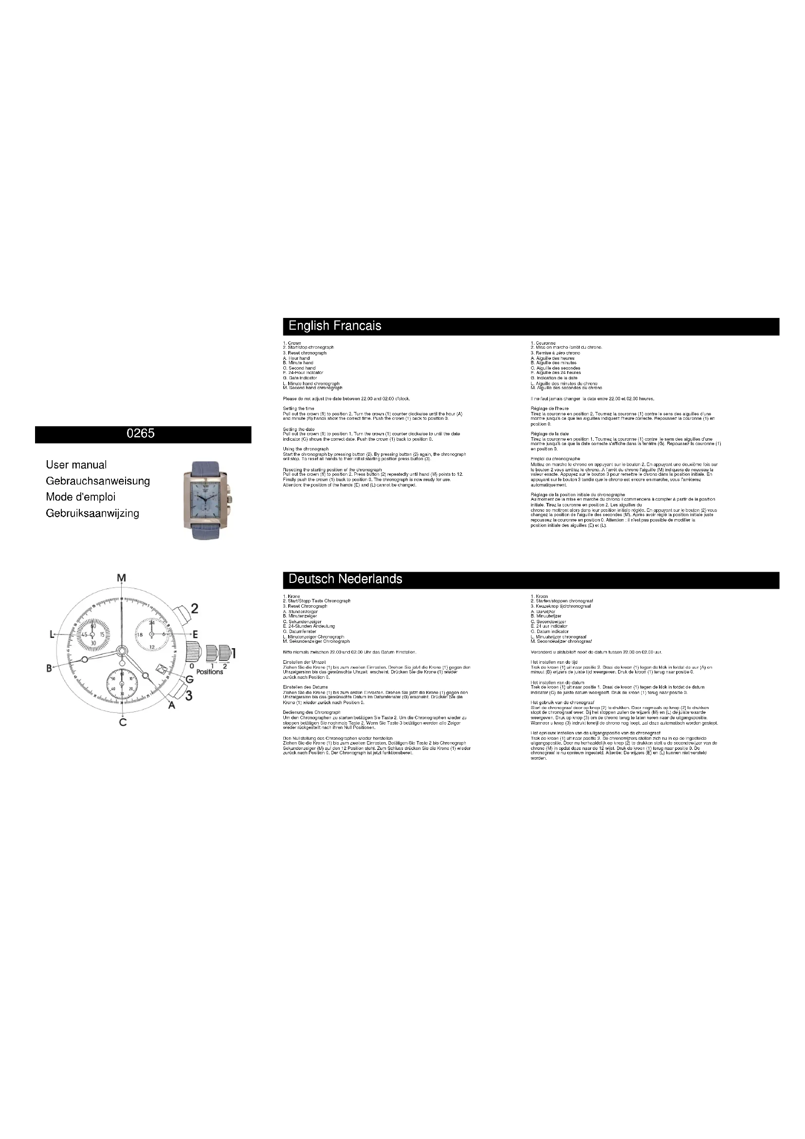 A. Aiguille des heures B. Aiguille des minutes C. Aiguille des secondes E. Aiguille des 24 heures G. Indication de la date L. Aiguille des minutes du chrono M. Aiguille des secondes du chrono Il ne faut jamais changer la date entre 22.00 et 02.00 heures. Réglage de l'heure Tirez la couronne en position 2. Tournez la couronne (1) contre le sens des aiguilles d'une montre jusqu'à ce que les aiguilles indiquent l'heure correcte. Repoussez la couronne (1) en position 0. Réglage de la date Tirez la couronne en position 1. Tournez la couronne (1) contre le sens des aiguilles d'une montre jusqu'à ce que la date correcte s'affiche dans la fenêtre (G). Repoussez la couronne (1) en position 0. Emploi du chronographe Mettez en marche le chrono en appuyant sur le bouton 2. En appuyant une deuxième fois sur le bouton 2 vous arrêtez le chrono. A l'arrêt du chrono l'aiguille (M) indiquera de nouveau la valeur exacte. Appuyez sur le bouton 3 pour remettre le chrono dans la position initiale. En appuyant sur le bouton 3 tandis que le chrono est encore en marche, vous l'arrêterez automatiquement. Réglage de la position initiale du chronographe Au moment de la mise en marche du chrono il commencera à compter à partir de la position initiale. Tirez la couronne en position 2. Les aiguilles du chrono se mettront alors dans leur position initiale réglée. En appuyant sur le bouton (2) vous changez la position de l'aiguille des secondes (M). Après avoir réglé la position initiale juste repoussez la couronne en position 0. Attention : il n'est pas possible de modifier la position initiale des aiguilles (E) et (L).