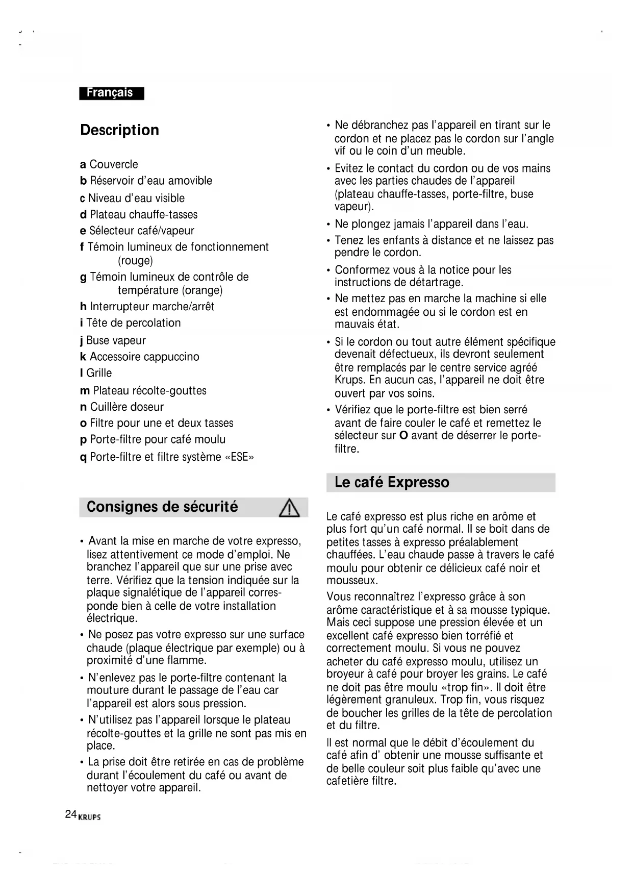 - Chill and add espresso and whipped cream. (* : The abuse of alcohol is dangerous to your health). FNC1/2/3.PM6.5 19/01/04, 16:172324 Description a Couvercle b Réservoir d’eau amovible c Niveau d’eau visible d Plateau chauffe-tasses e Sélecteur café/vapeur f Témoin lumineux de fonctionnement (rouge) g Témoin lumineux de contrôle de température (orange) h Interrupteur marche/arrêt i Tête de percolation j Buse vapeur k Accessoire cappuccino l Grille m Plateau récolte-gouttes n Cuillère doseur o Filtre pour une et deux tasses p Porte-filtre pour café moulu q Porte-filtre et filtre système «ESE» Consignes de sécurité