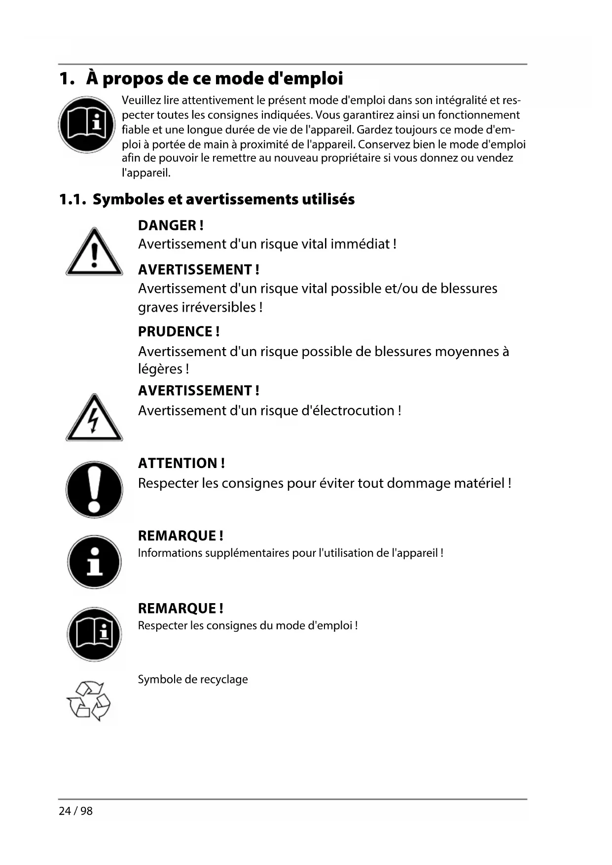 Veuillez lire attentivement le présent mode d'emploi dans son intégralité et res- pecter toutes les consignes indiquées. Vous garantirez ainsi un fonctionnement fiable et une longue durée de vie de l'appareil. Gardez toujours ce mode d'em- ploi à portée de main à proximité de l'appareil. Conservez bien le mode d'emploi afin de pouvoir le remettre au nouveau propriétaire si vous donnez ou vendez l'appareil. 1.1. Symboles et avertissements utilisés DANGER ! Avertissement d'un risque vital immédiat ! AVERTISSEMENT ! Avertissement d'un risque vital possible et/ou de blessures graves irréversibles ! PRUDENCE ! Avertissement d'un risque possible de blessures moyennes à légères! AVERTISSEMENT ! Avertissement d'un risque d'électrocution ! ATTENTION! Respecter les consignes pour éviter tout dommage matériel ! REMARQUE ! Informations supplémentaires pour l'utilisation de l'appareil ! REMARQUE ! Respecter les consignes du mode d'emploi ! Symbole de recyclageDE