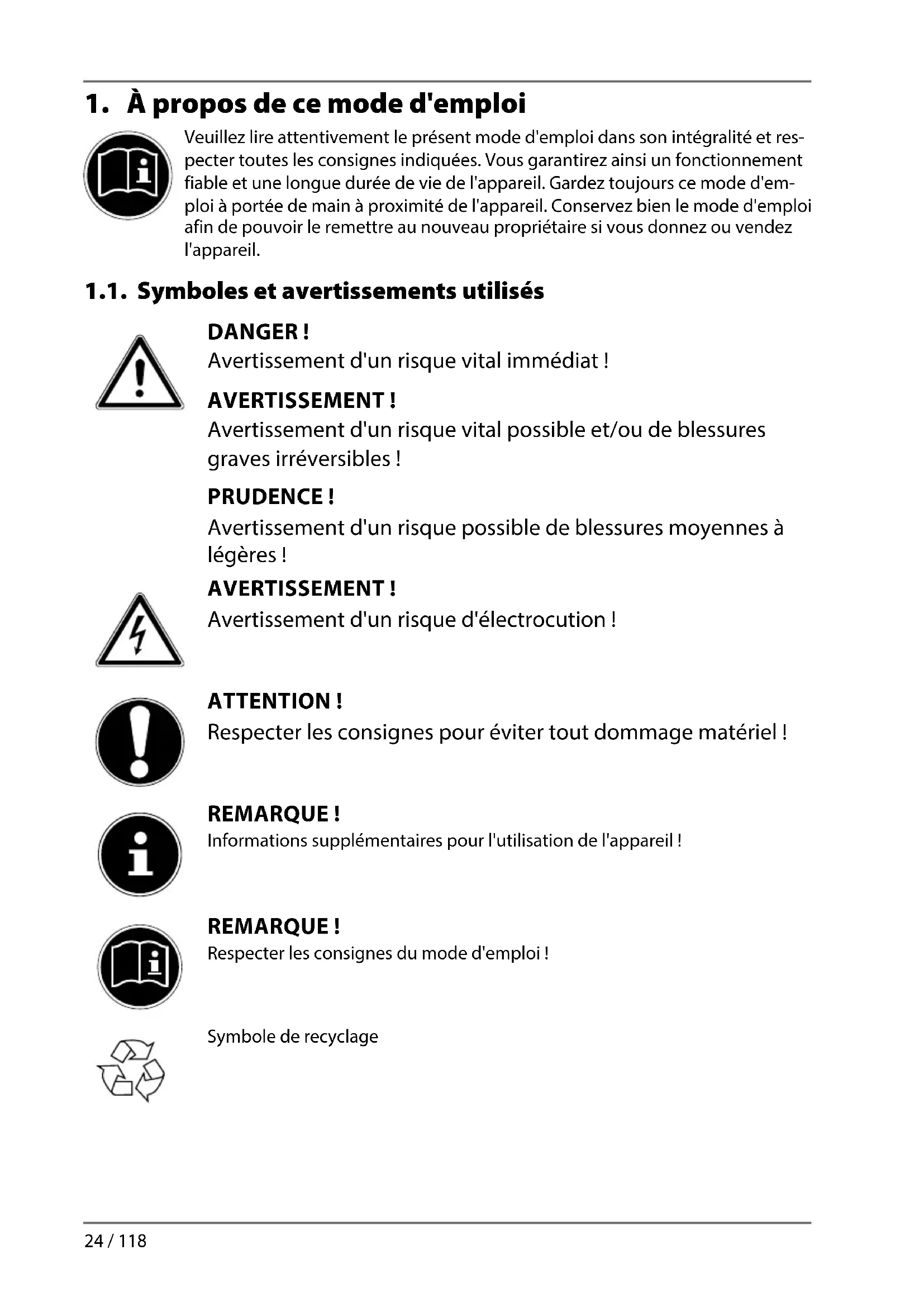 Veuillez lire attentivement le présent mode d'emploi dans son intégralité et res- pecter toutes les consignes indiquées. Vous garantirez ainsi un fonctionnement fiable et une longue durée de vie de l'appareil. Gardez toujours ce mode d'em- ploi à portée de main à proximité de l'appareil. Conservez bien le mode d'emploi afin de pouvoir le remettre au nouveau propriétaire si vous donnez ou vendez l'appareil. 1.1. Symboles et avertissements utilisés DANGER ! Avertissement d'un risque vital immédiat ! AVERTISSEMENT ! Avertissement d'un risque vital possible et/ou de blessures graves irréversibles ! PRUDENCE ! Avertissement d'un risque possible de blessures moyennes à légères! AVERTISSEMENT ! Avertissement d'un risque d'électrocution ! ATTENTION! Respecter les consignes pour éviter tout dommage matériel ! REMARQUE ! Informations supplémentaires pour l'utilisation de l'appareil ! REMARQUE ! Respecter les consignes du mode d'emploi ! Symbole de recyclageDE
