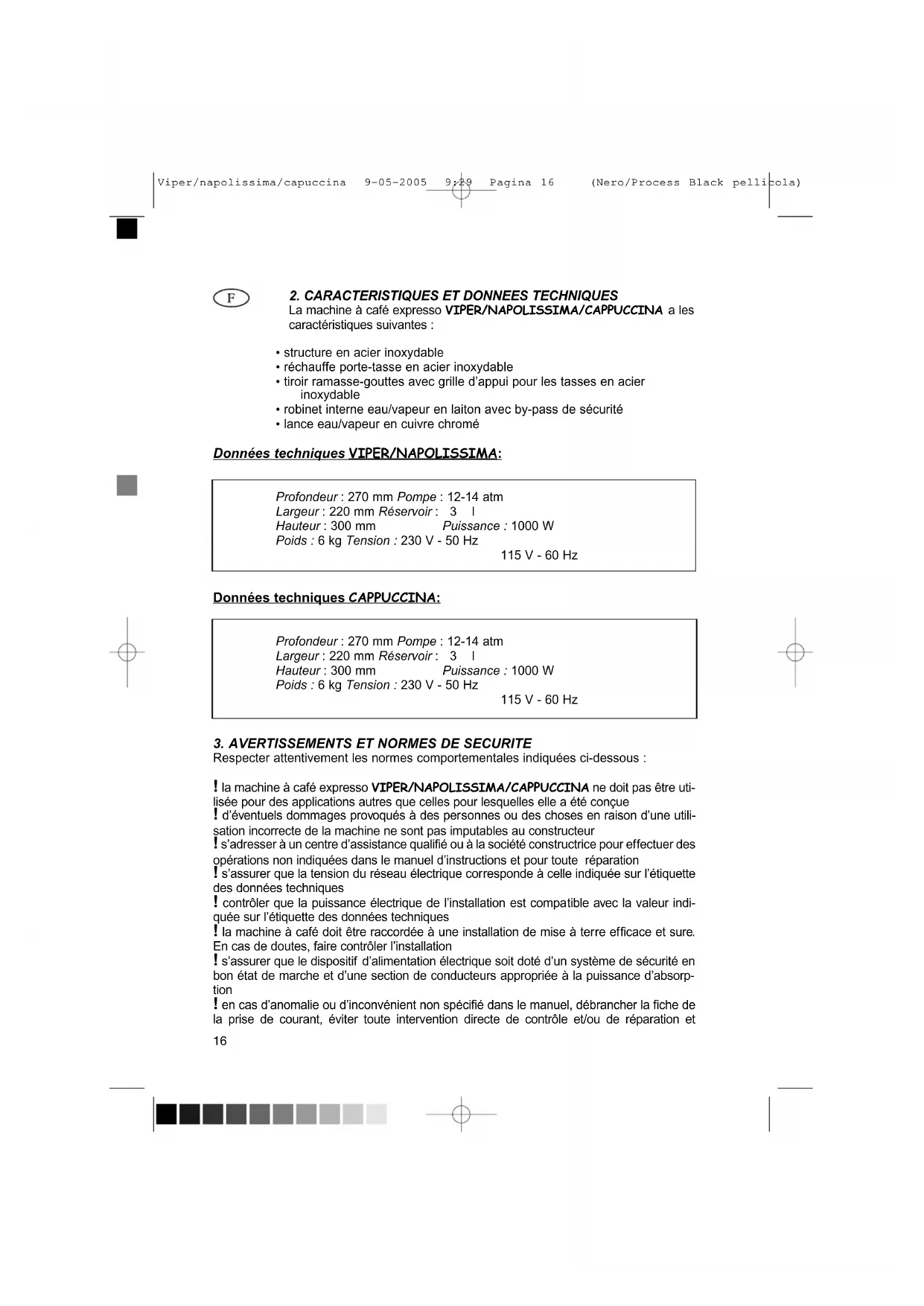 - lance eau/vapeur en cuivre chromé Données techniques VIPER/NAPOLISSIMA: Profondeur : 270 mm Pompe : 12-14 atm Largeur : 220 mm Réservoir :3 l Hauteur : 300 mm Puissance : 1000 W Poids : 6 kg Tension : 230 V - 50 Hz 115 V - 60 Hz Données techniques CAPPUCCINA: Profondeur : 270 mm Pompe : 12-14 atm Largeur : 220 mm Réservoir :3 l Hauteur : 300 mm Puissance : 1000 W Poids : 6 kg Tension : 230 V - 50 Hz 115 V - 60 Hz