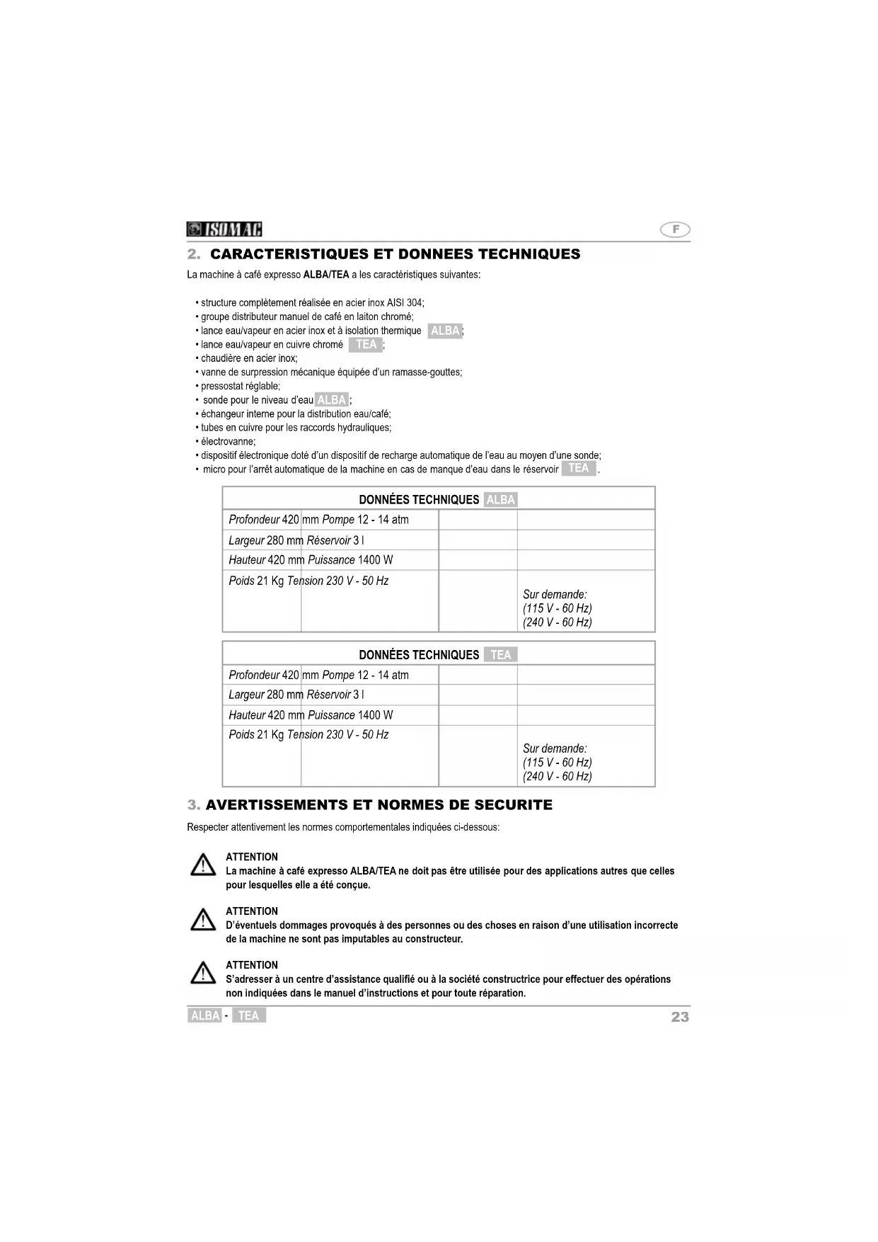 Respecter attentivement les normes comportementales indiquées ci-dessous: ATTENTION La machine à café expresso ALBA/TEA ne doit pas être utilisée pour des applications autres que celles pour lesquelles elle a été conçue. ATTENTION D’éventuels dommages provoqués à des personnes ou des choses en raison d’une utilisation incorrecte de la machine ne sont pas imputables au constructeur. ATTENTION S’adresser à un centre d’assistance qualifié ou à la société constructrice pour effectuer des opérations non indiquées dans le manuel d’instructions et pour toute réparation.