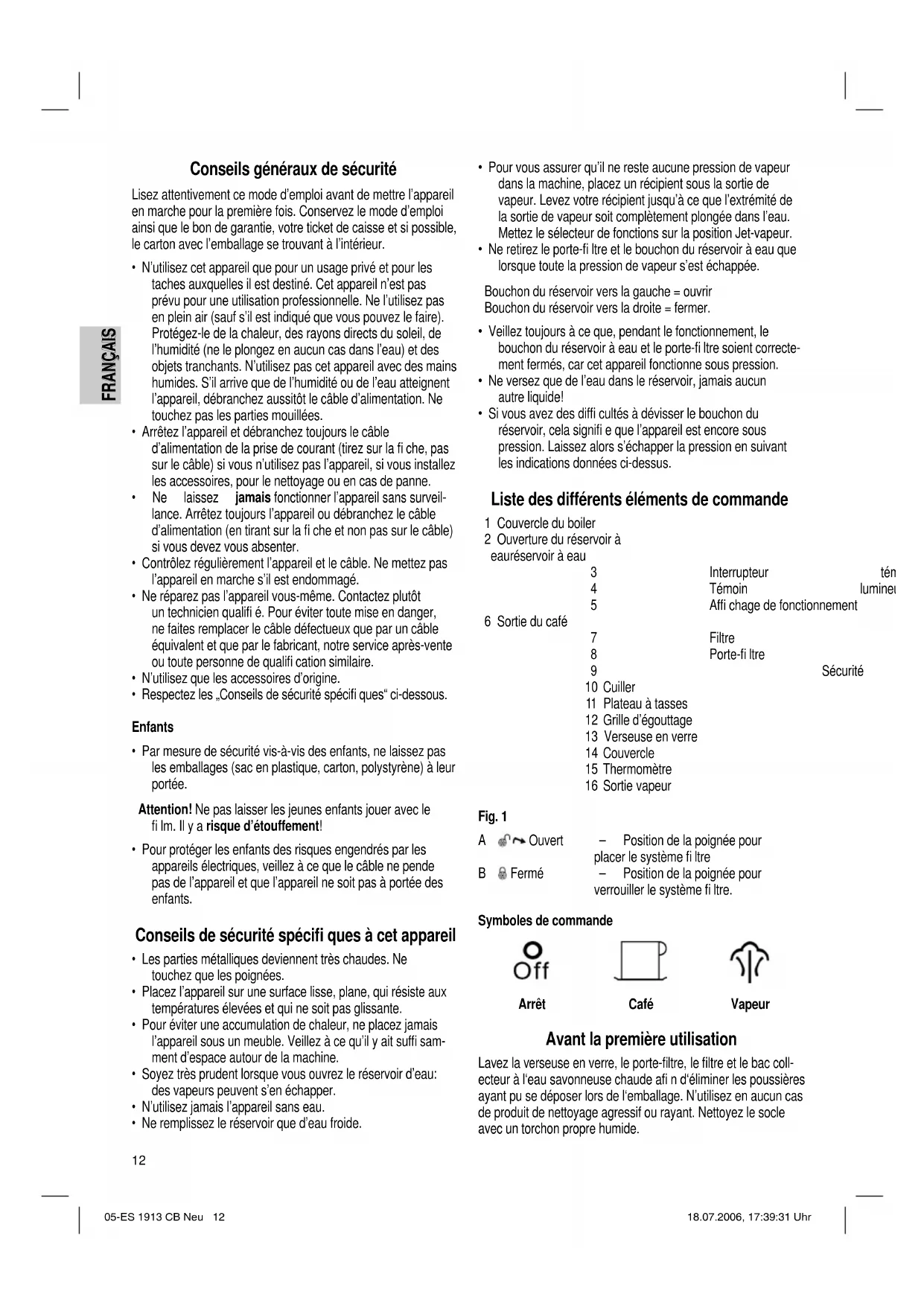 - Si vous avez des diffi cultés à dévisser le bouchon du réservoir, cela signifi e que l’appareil est encore sous pression. Laissez alors s’échapper la pression en suivant les indications données ci-dessus. Liste des différents éléments de commande 1 Couvercle du boiler 2 Ouverture du réservoir à eauréservoir à eau 3 Interrupteur témoin 4 Témoin lumineux „Terminé“ 5 Affi chage de fonctionnement 6 Sortie du café 7 Filtre 8 Porte-fi ltre 9 Sécurité fi ltre 10 Cuiller 11 Plateau à tasses 12 Grille d’égouttage 13 Verseuse en verre 14 Couvercle 15 Thermomètre 16 Sortie vapeur Fig. 1 A Ouvert – Position de la poignée pour placer le système fi ltre B Fermé – Position de la poignée pour verrouiller le système fi ltre. Symboles de commande Arrêt Café Vapeur Avant la première utilisation Lavez la verseuse en verre, le porte-fi ltre, le fi ltre et le bac coll- ecteur à l‘eau savonneuse chaude afi n d‘éliminer les poussières ayant pu se déposer lors de l‘emballage. N’utilisez en aucun cas de produit de nettoyage agressif ou rayant. Nettoyez le socle avec un torchon propre humide. 05-ES 1913 CB Neu 12 18.07.2006, 17:39:31 UhrFRANÇAIS