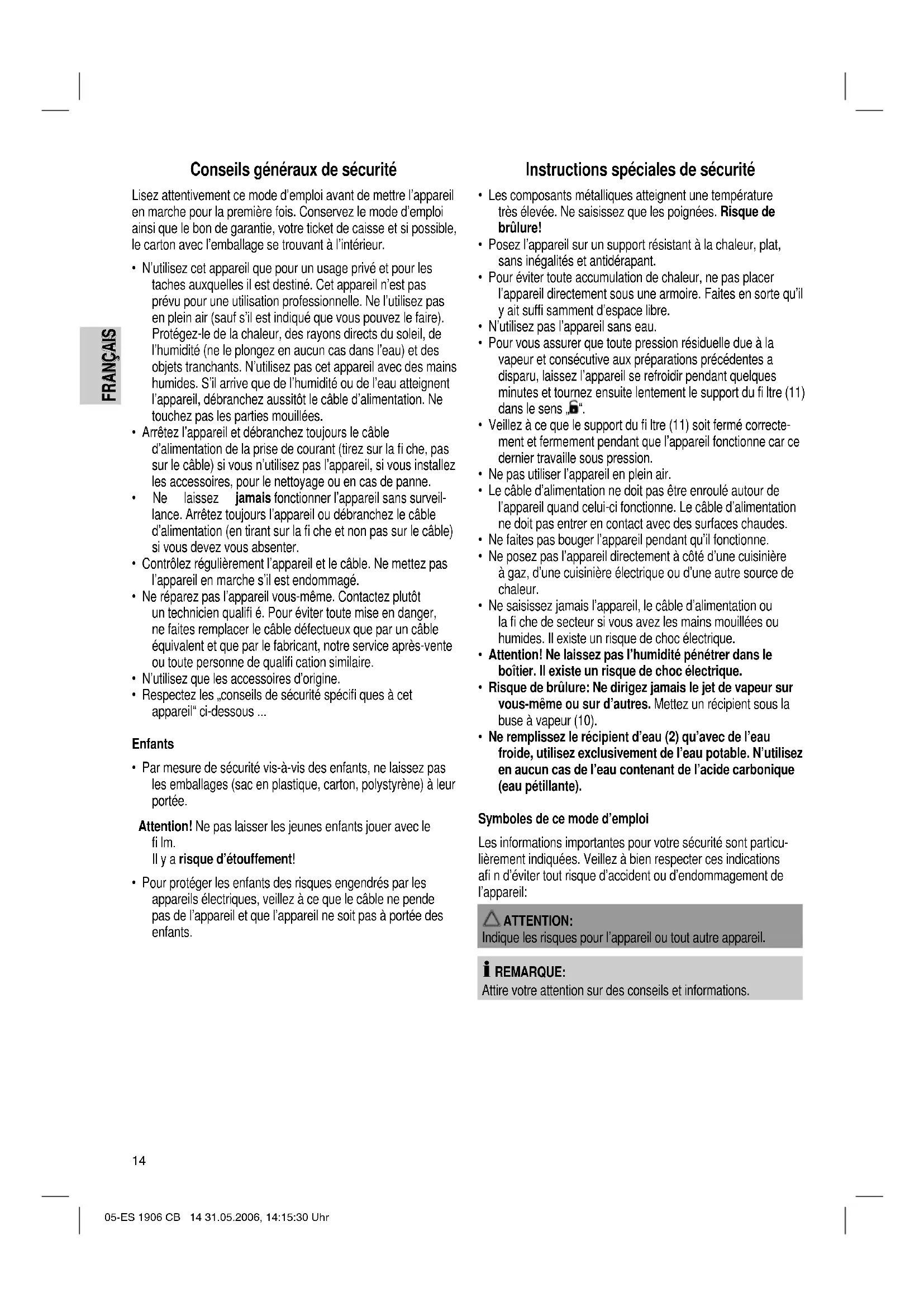 - Ne remplissez le récipient d’eau (2) qu’avec de l’eau froide, utilisez exclusivement de l’eau potable. N’utilisez en aucun cas de l’eau contenant de l’acide carbonique (eau pétillante). Symboles de ce mode d’emploi Les informations importantes pour votre sécurité sont particu- lièrement indiquées. Veillez à bien respecter ces indications afi n d’éviter tout risque d’accident ou d’endommagement de l’appareil: ATTENTION: Indique les risques pour l’appareil ou tout autre appareil. REMARQUE: Attire votre attention sur des conseils et informations. 05-ES 1906 CB 14 31.05.2006, 14:15:30 UhrFRANÇAIS