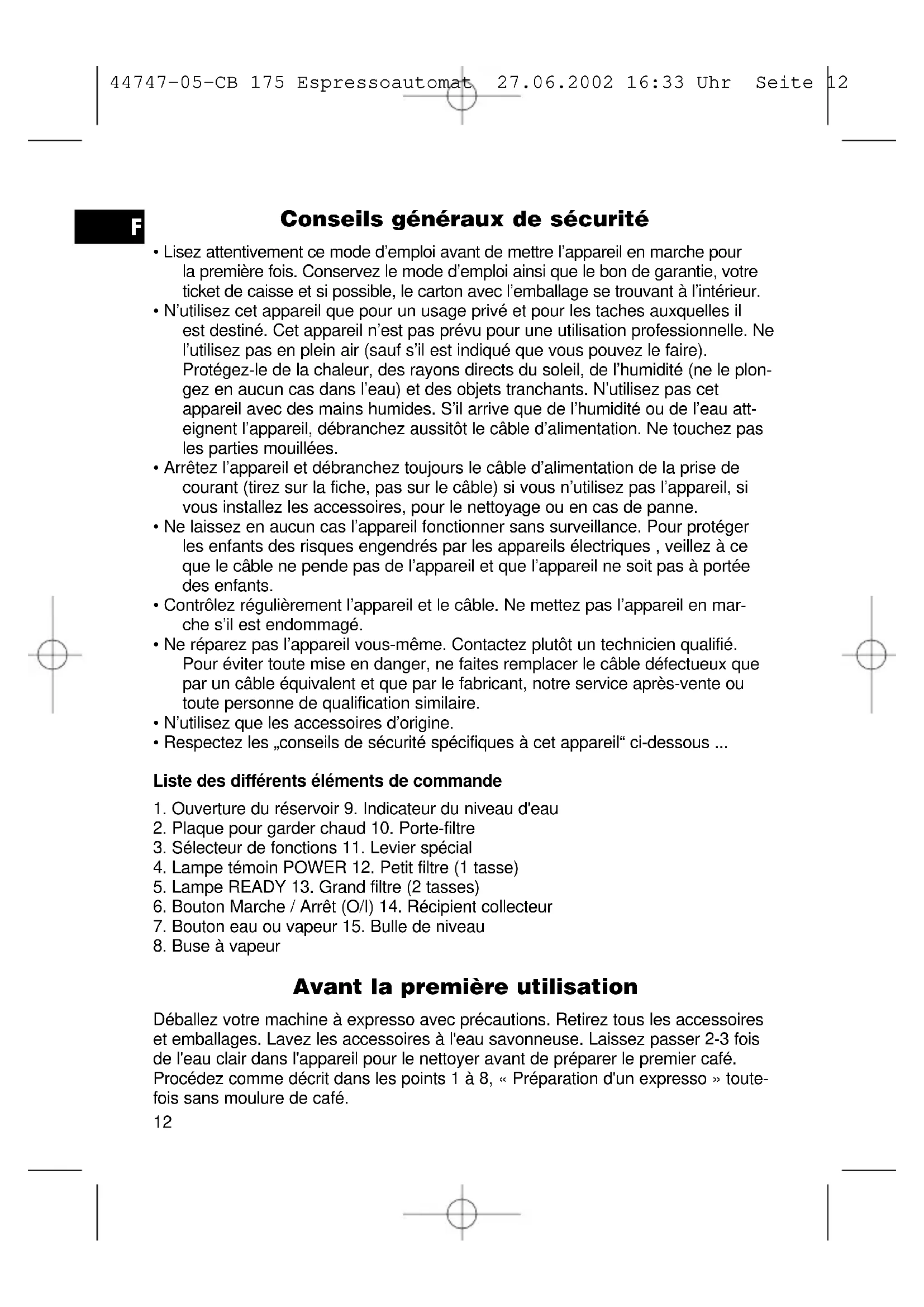 44747-05-CB 175 Espressoautomat 27.06.2002 16:33 Uhr Seite 14un récipient résistant à la chaleur rempli d'eau sous la buse, de manière à ce que la buse soit plongée dans l'eau. Tournez le sélecteur de fonctions sur la position vapeur. Essuyez la buse à vapeur avec un torchon humide pour retirer les dépôts de lait avant qu'ils durcissent. Vous pouvez laver le réservoir à eau, le bac collec- teur, la grille du bac, le filtre, le porte-filtre et la plaque chauffante à l'eau savonneu- se chaude. N'utilisez aucun de détergent abrasif. Lavez ces pièces de l'appareil régulièrement. Si les perforations du filtre se bouchent, nettoyez-les avec une fine brosse souple. Ne lavez pas la machine. Ne lavez jamais aucune pièce ni accessoire de l'appareil dans le lave-vaisselle. Cet appareil est équipé d'une sécurité anti-trop-plein. A l'avant du bac collecteur se trouve une bulle de niveau de couleur rouge. Plus le bac collecteur est rempli d'eau, plus la bulle monte. Pour vider le bac collecteur, vous pouvez le retirer com- plètement et soulever la grille. Cet appareil satisfait aux directives CE pour l'antiparasitage et pour la sécurité basse tension et a été conçu selon les toutes récentes prescriptions techniques de sécurité. Sous réserve de modifications techniques. Garantie Nous fournissons une garantie de 24 mois à partir de la date d’achat (ticket de caisse) pour tous les appareils de notre marque. Nous assurons les réparations ou le remplacement des appareils pour toutes les pannes et tous les défauts de matériau ou de fabrication, apparus pendant la durée de la garantie. Le ticket de caisse est votre certificat de garantie. Sans cette preuve d’achat, aucun remplacement ni aucune réparation ne seront faits gratuitement. Si vous devez avoir recours à la garantie, rapportez tout votre appareil dans l’em- ballage original avec le ticket de caisse à votre vendeur. Les débris de verre et le mauvais fonctionnement des accessoires ne peuvent justi- fier le remplacement de tout l’appareil mais seront remplacés individuellement et gratuitement. Il n’est donc pas nécessaire, dans ce cas, de renvoyer tout l’appareil. Il vous suffit de commander les accessoires défectueux ! Le nettoyage, la maintenance et le remplacement des pièces résistantes à l’usure ne font pas partie de la garantie et ne sont donc pas proposés gratuitement. La garantie est annulée lorsque l’appareil est utilisée par une tierce personne. Après la garantie Après expiration de la garantie, les réparations peuvent être effectuées, moyennant paiement, par des commerces spécialisés ou des services de réparations qualifiés.