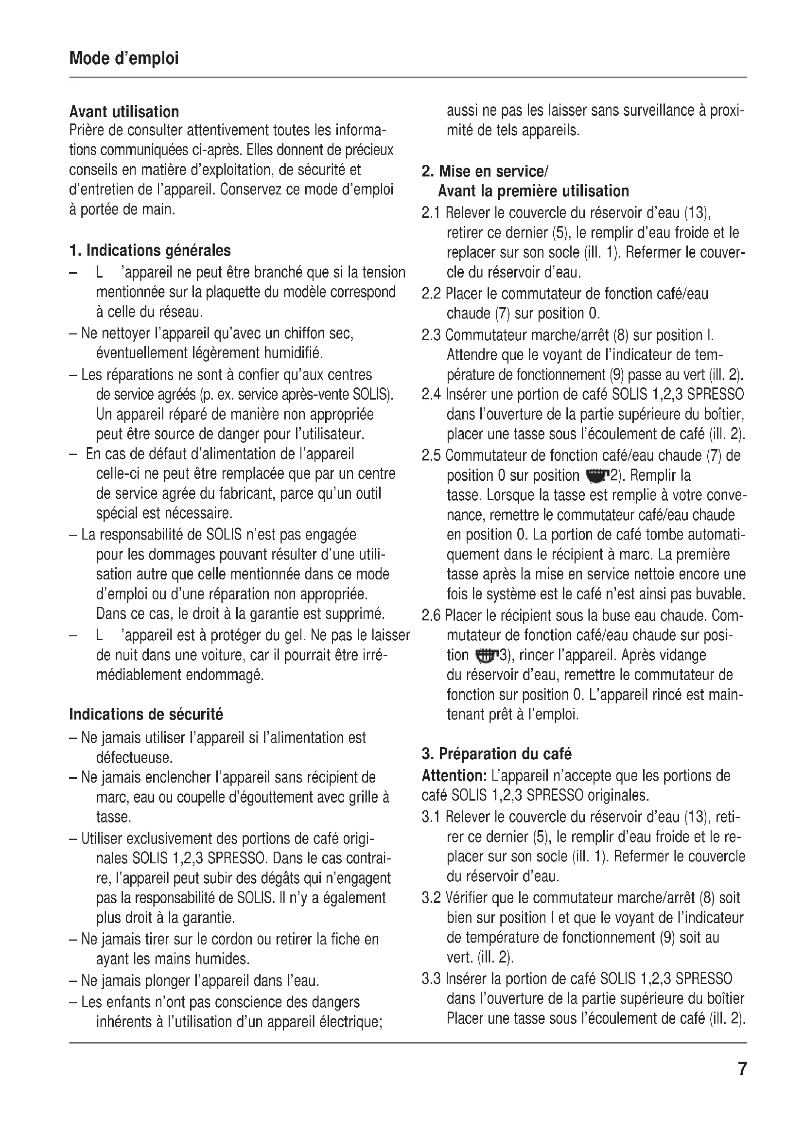 –L’appareil ne peut être branché que si la tension mentionnée sur la plaquette du modèle correspond à celle du réseau. – Ne nettoyer l’appareil qu’avec un chiffon sec, éventuellement légèrement humidifié. – Les réparations ne sont à confier qu’aux centres de service agréés (p. ex. service après-vente SOLIS). Un appareil réparé de manière non appropriée peut être source de danger pour l’utilisateur. – En cas de défaut d’alimentation de l’appareil celle-ci ne peut être remplacée que par un centre de service agrée du fabricant, parce qu’un outil spécial est nécessaire. – La responsabilité de SOLIS n’est pas engagée pour les dommages pouvant résulter d’une utili- sation autre que celle mentionnée dans ce mode d’emploi ou d’une réparation non appropriée. Dans ce cas, le droit à la garantie est supprimé. –L’appareil est à protéger du gel. Ne pas le laisser de nuit dans une voiture, car il pourrait être irré- médiablement endommagé. Indications de sécurité – Ne jamais utiliser l’appareil si l’alimentation est défectueuse. – Ne jamais enclencher l’appareil sans récipient de marc, eau ou coupelle d’égouttement avec grille à tasse. – Utiliser exclusivement des portions de café origi- nales SOLIS 1,2,3 SPRESSO. Dans le cas contrai- re, l’appareil peut subir des dégâts qui n’engagent pas la responsabilité de SOLIS. Il n’y a également plus droit à la garantie. – Ne jamais tirer sur le cordon ou retirer la fiche en ayant les mains humides. – Ne jamais plonger l’appareil dans l’eau. – Les enfants n’ont pas conscience des dangers inhérents à l’utilisation d’un appareil électrique; aussi ne pas les laisser sans surveillance à proxi- mité de tels appareils.
