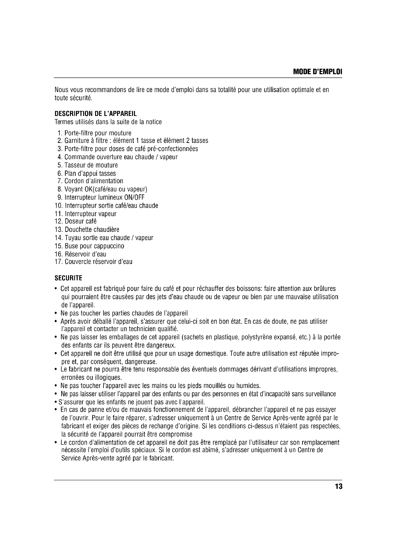 - Cet appareil est fabriqué pour faire du café et pour réchauffer des boissons: faire attention aux brûlures qui pourraient être causées par des jets d’eau chaude ou de vapeur ou bien par une mauvaise utilisation de l’appareil.
