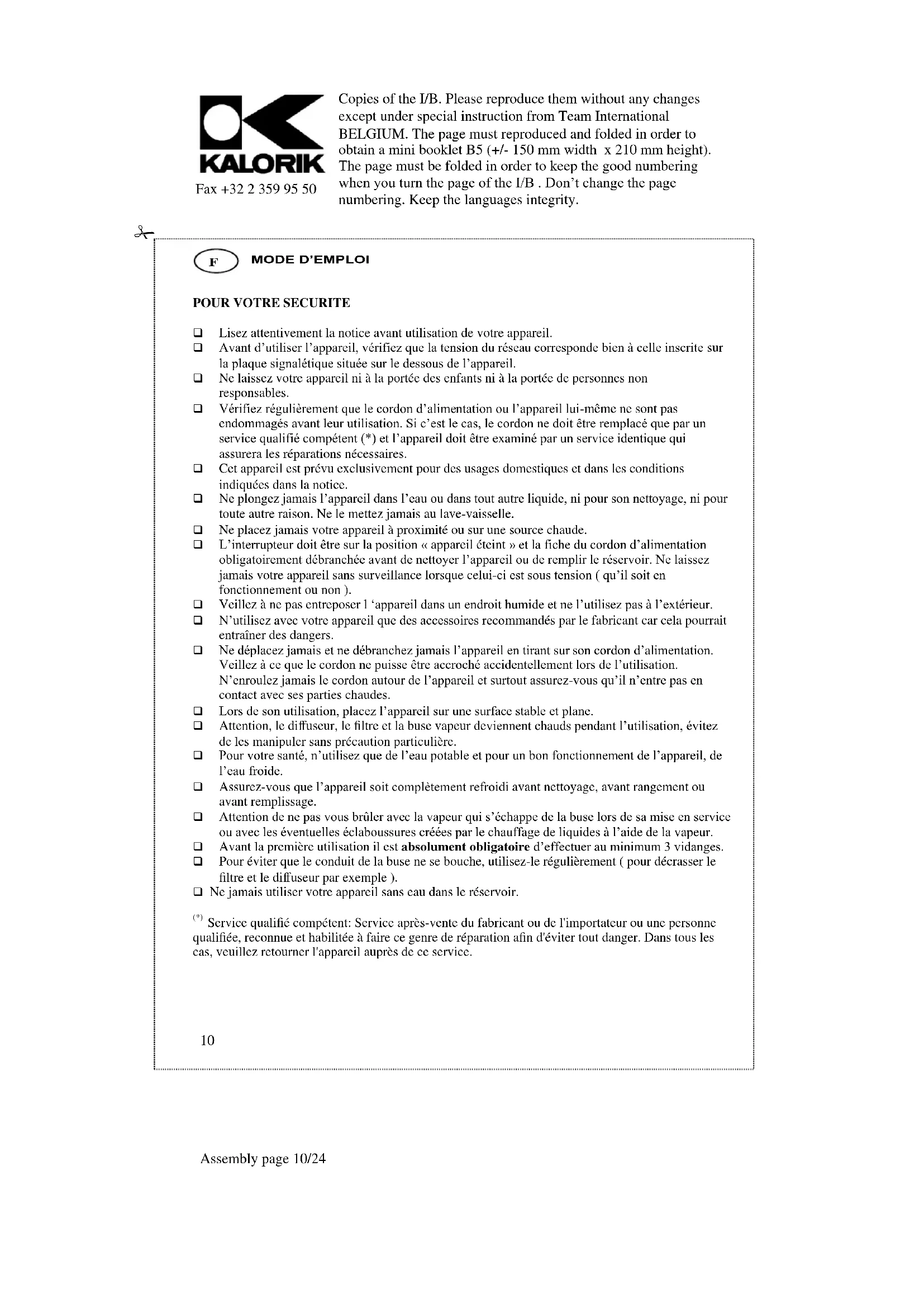 Suivre impérativement les instructions de sécurité. Nettoyez le diffuseur et le filtre avec de l‟eau chaude savonneuse. Vous pouvez utiliser la vapeur produite par l‟appareil pour décrasser le filtre et la tête du diffuseur mais prenez garde de ne pas vous brûler. Après avoir préparé un « cappuccino », nettoyez l‟embout de la buse vapeur. Vous pouvez le retirer en tirant dessus. Il est aussi conseillé d‟essuyer le tube métallique afin d‟éviter les traces de calcaire. Nettoyez les surfaces extérieures avec un chiffon doux, humide et un nettoyant léger. Ne jamais utiliser de nettoyants abrasifs ou d‟objets pointus (ex : paille de fer). Videz régulièrement le récipient collecteur pour une question d‟hygiène.Copies of the I/B. Please reproduce them without any changes except under special instruction from Team International BELGIUM. The page must reproduced and folded in order to obtain a mini booklet B5 (+/- 150 mm width x 210 mm height). The page must be folded in order to keep the good numbering when you turn the page of the I/B . Don‟t change the page numbering. Keep the languages integrity.