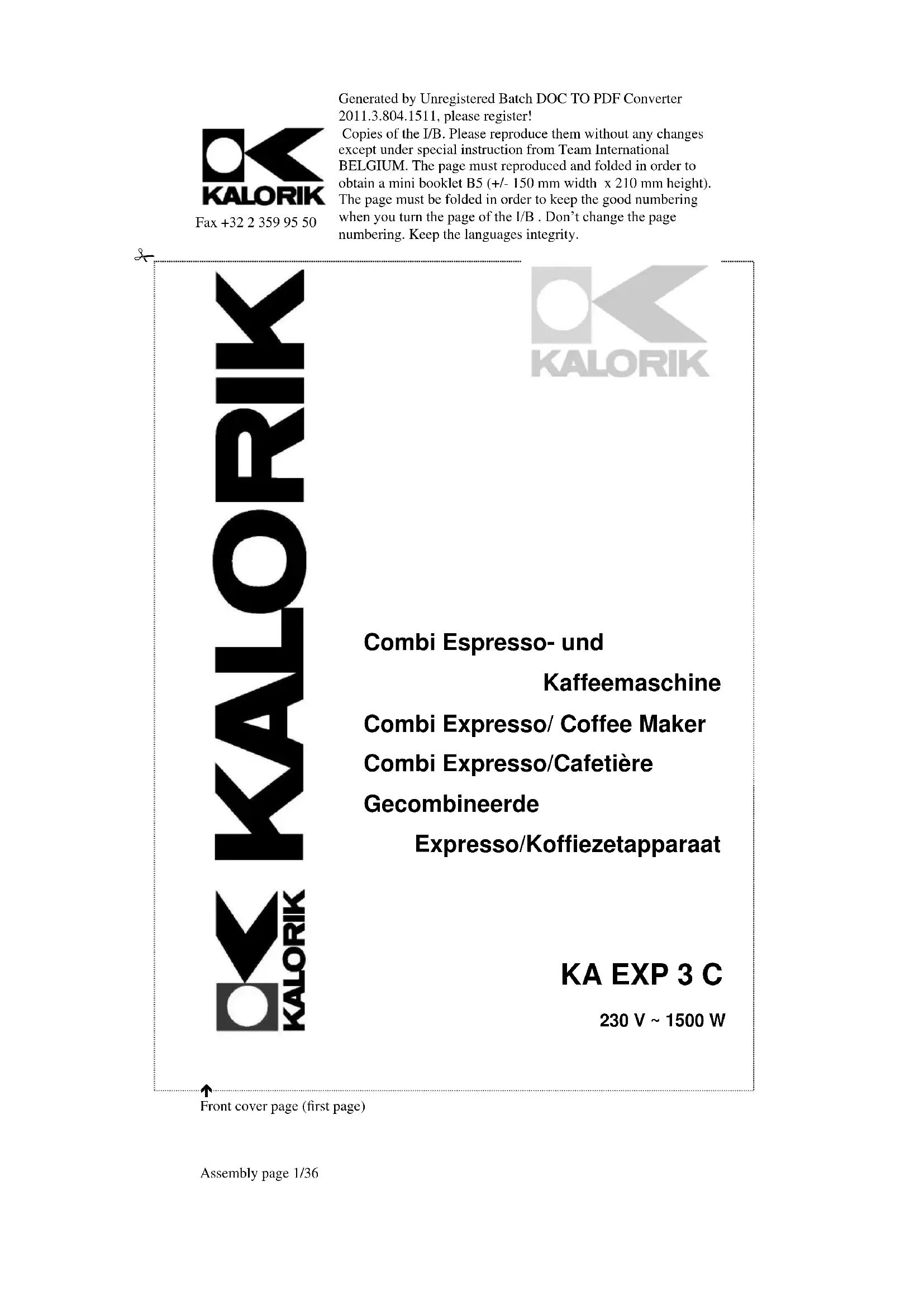 bac de récupération (k) puis retournez la machine à l‟envers au dessus d‟un évier pour vider l‟eau restant dans le réservoir. Ces précautions de sécurité doivent être respectées, non seulement lorsque la machine est allumée, mais également pendant les 10 à 15 minutes qui suivent l’arrêt de l’appareil. PRECAUTIONS PARTICULIERES AUX VERSEUSES « CAFE » ET « EXPRESSO » Pour éviter de casser les verseuses : N‟attendez pas que tout le liquide se soit évaporé des verseuses. Ne faites pas chauffer les verseuses lorsqu‟elles sont vides. Changez vos verseuses si elles sont endommagées de quelque manière que ce soit. Si elles sont ébréchées ou fêlées, elles pourraient se casser ou laisser passer des particules de verre dans le liquide. Ne mettez pas les verseuses chaudes sur une surface froide ou mouillée. N‟utilisez pas les verseuses si les poignées sont fêlées ou cassées. N‟utilisez pas d‟éponges métalliques pour nettoyer les verseuses, car elles pourraient rayer et ainsi affaiblir le verre. Ne mettez pas les verseuses sur ou près d‟un réchaud électrique ou à gaz dans un four ou dans un micro-ondes. Evitez toute manipulation brutale ou tous chocs.Copies of the I/B. Please reproduce them without any changes except under special instruction from Team International BELGIUM. The page must reproduced and folded in order to obtain a mini booklet B5 (+/- 150 mm width x 210 mm height). The page must be folded in order to keep the good numbering when you turn the page of the I/B . Don‟t change the page numbering. Keep the languages integrity.