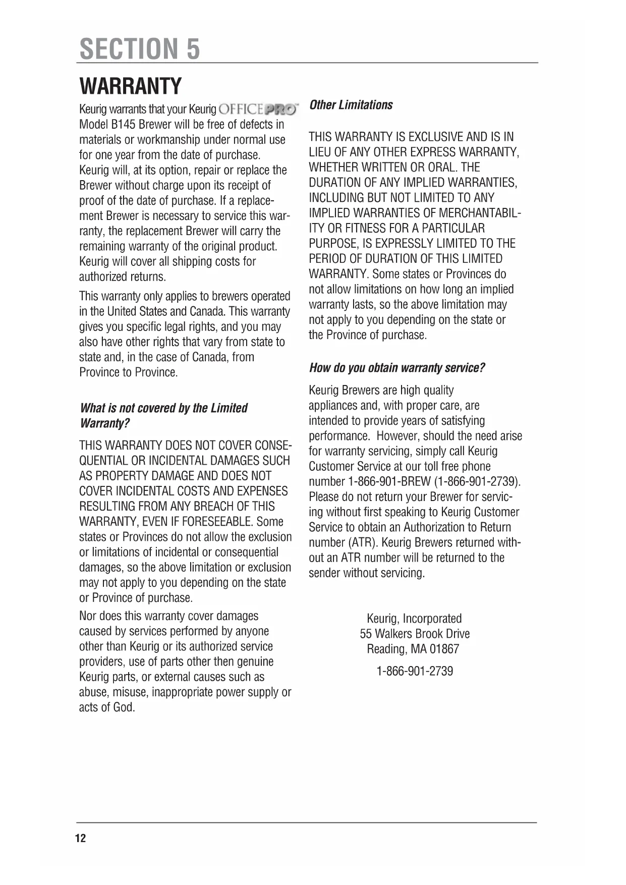 GARANTIE Keurig garantit que chaque cafetière Modèle B145 est exempte de tout défaut de pièces ou de fabrication, sous réserve d'une utilisation normale, pendant un an à partir de la date d'achat. Keurig réparera ou remplacera, à son choix, la cafetière défectueuse sans frais à la réception d'une preuve de la date d'achat. Si la cafetière doit être remplacée durant la période de garantie, la cafetière de rechange bénéficiera du reste de la période de garantie du produit original. Keurig paiera tous les frais d'expédition pour les retours autorisés. La présente garantie ne s'applique qu'aux cafetières utilisées au Canada et aux États-Unis. La présente garantie vous confère des droits légaux précis et il se peut que vous bénéficiiez d'autres droits qui peuvent varier d'une province à l'autre, et, dans le cas des États-Unis, d'un État à l'autre. Qu'est-ce qui n'est pas couvert par la garantie limitée? LA PRÉSENTE GARANTIE NE COUVRE PAS LES