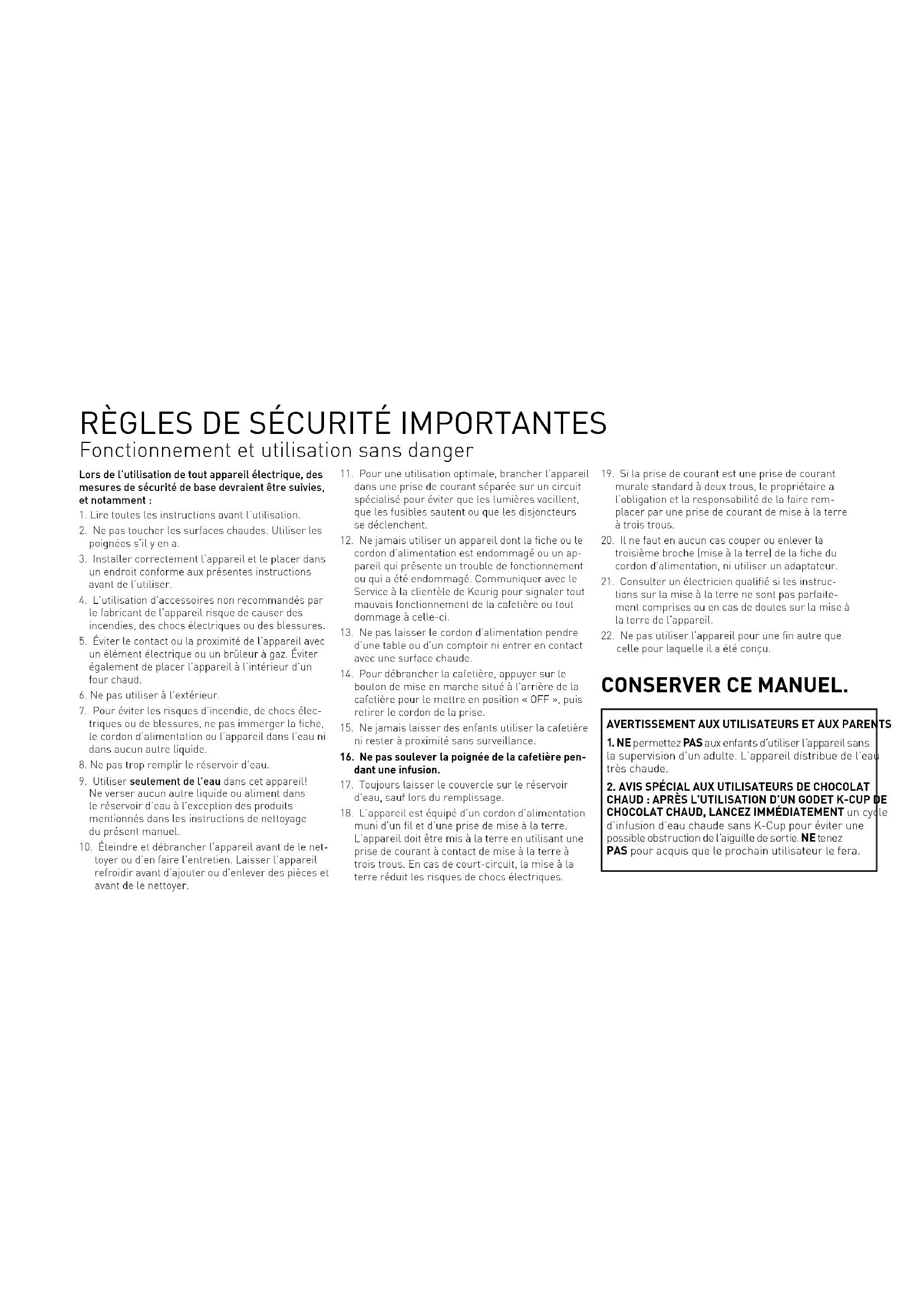 CHAUD : APRÈS L’UTILISATION D’UN GODET K-CUP DE CHOCOLAT CHAUD, LANCEZ IMMÉDIATEMENT un cycle d’infusion d’eau chaude sans K-Cup pour éviter une possible obstruction de l’aiguille de sortie. NE tenez PAS pour acquis que le prochain utilisateur le fera.ATTENTION : Le godet K-Cup est perforé par deux aiguilles, une au-dessus du support à K-Cup et l’autre au fond du support à K-Cup. Pour éviter tout risque de blessure, ne pas mettre les doigts dans le boîtier du support à K-Cup. ATTENTION : L’eau se trouvant dans le support à K-Cup durant l’infusion est extrêmement chaude. Pour éviter tout risque de blessure, ne pas soulever la poignée ni ouvrir le boîtier du support à K-Cup durant l’infusion.DIRECTIVES POUR CORDON D’ALIMENTATION COURT : L’appareil est doté d’un cordon d’alimentation court pour éviter qu’il s’emmêle ou que quelqu’un trébuche sur un cordon long. Si une rallonge est utilisée, (1) les caractéristiques électriques inscrites sur la rallonge doivent égaler ou excéder celles de l’appareil, (2) le cordon doit être fixé de façon à ce qu’il ne pende pas d’une table ou d’un comptoir pour éviter qu’un enfant puisse le saisir ou que quelqu’un trébuche et (3) la ral-longe doit être munie d’une prise de mise à la terre à trois broches.CE PRODUIT EST DESTINÉ À UNE UTILISATION DOMESTIQUE SEULEMENT.