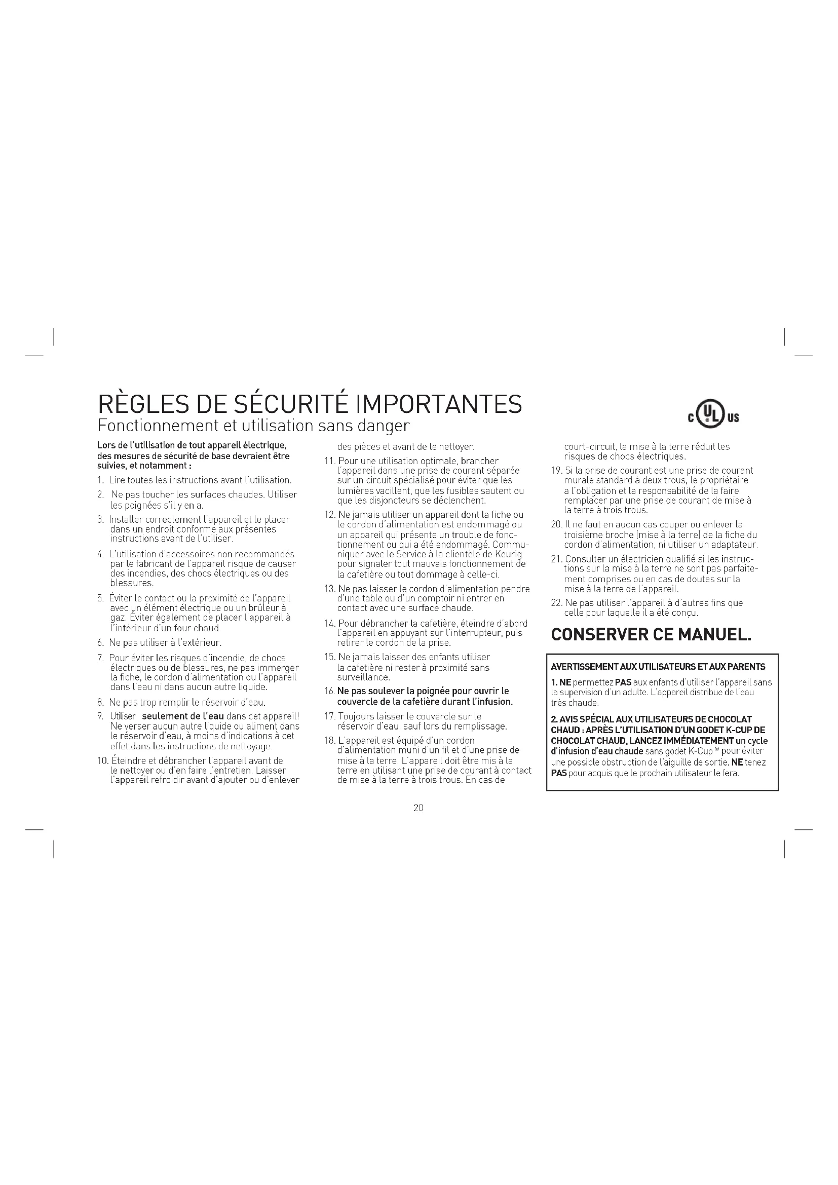 ATTENTION : L’eau se trouvant dans le support à godet K-Cup durant l’infusion est extrêmement chaude. Pour éviter tout risque de blessure, ne pas soulever la poignée ni ouvrir le boîtier du support à godet K-Cup durant l’infusion.DIRECTIVES POUR CORDON D’ALIMENTATION COURT : L’appareil est doté d’un cordon d’alimentation court pour éviter qu’il s’emmêle ou que quelqu’un trébuche sur un cordon long. Si une rallonge est utilisée, (1) les caractéristiques électriques inscrites sur la rallonge doivent égaler ou excéder celles de l’appareil, (2) le cordon doit être fixé de façon à ce qu’il ne pende pas d’une table ou d’un comptoir pour éviter qu’un enfant puisse le saisir ou que quelqu’un trébuche et (3) la rallonge doit être munie d’une prise de mise à la terre à trois broches. CE PRODUIT EST DESTINÉ À UNE UTILISATION DOMESTIQUE ET COMMERCIALE