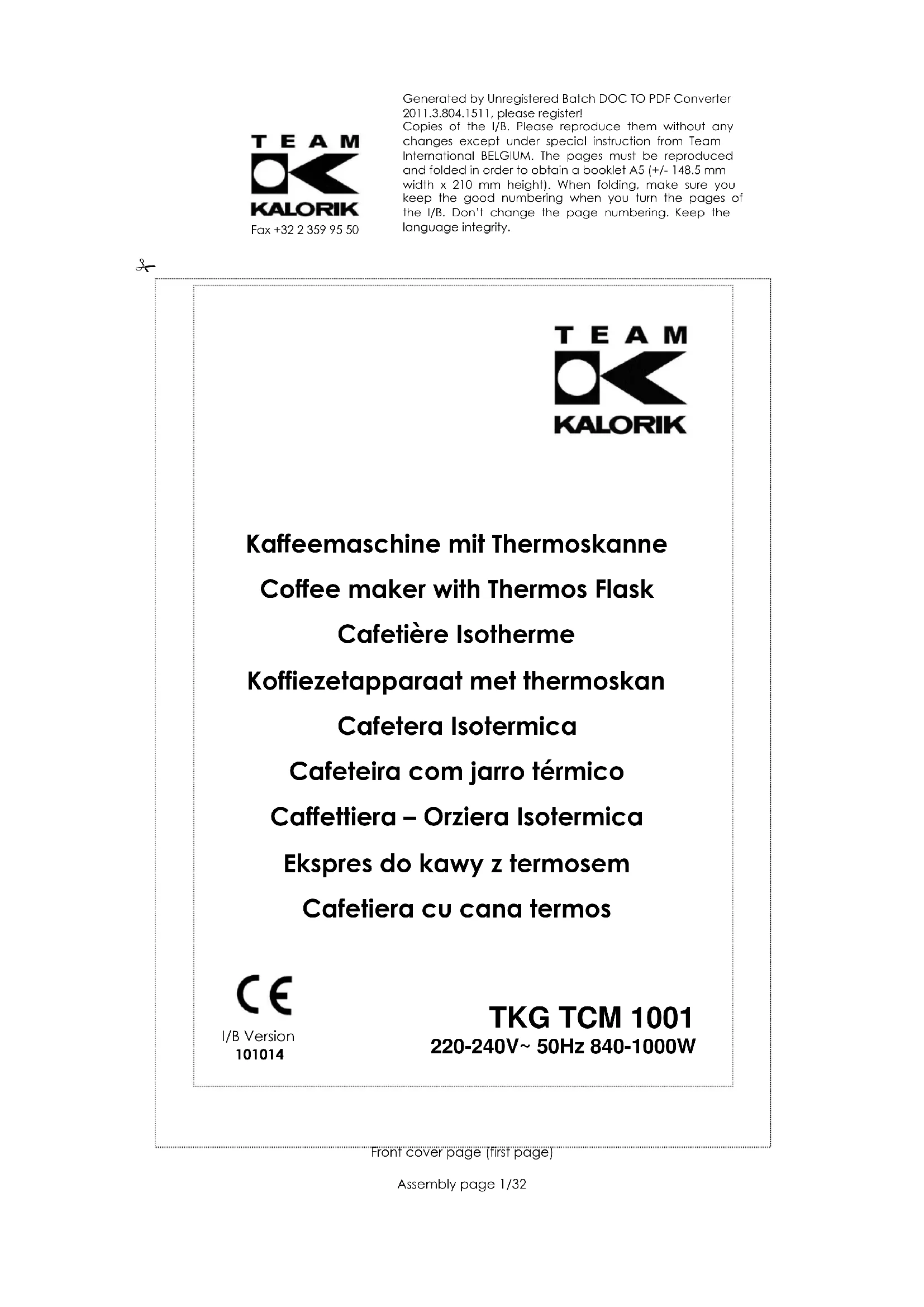 Avant tout nettoyage, éteignez l’appareil, débranchez-le et laissez-le refroidir. Le filtre, le porte-filtre, la verseuse et le couvercle de la verseuse peuvent se nettoyer dans de l’eau chaude savonneuse. La cafetière peut se nettoyer à l’aide d’un chiffon humide. Ne mettez jamais votre cafetière dans l’eau ou tout autre liquide. N’utilisez pas de produits abrasifs ou de solvants. Détartrer la cafetière prolonge sa durée de vie. Pour le détartrage, n’utilisez que des produits spécialement conçus pour le détartrage des cafetières. Copies of the I/B. Please reproduce them without any changes except under special instruction from Team International BELGIUM. The pages must be reproduced and folded in order to obtain a booklet A5 (+/- 148.5 mm width x 210 mm height). When folding, make sure you keep the good numbering when you turn the pages of the I/B. Don’t change the page numbering. Keep the language integrity.