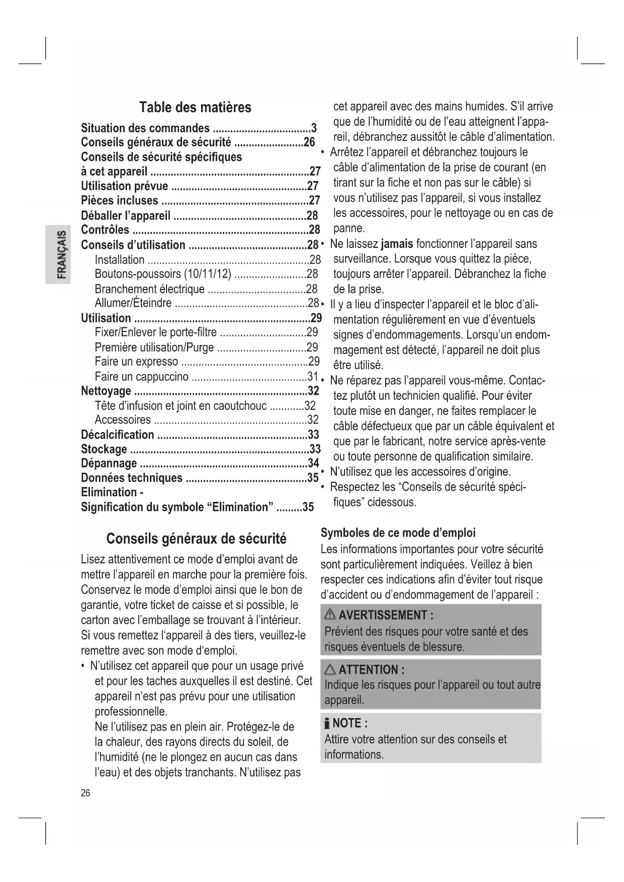 Prévient des risques pour votre santé et des risques éventuels de blessure. ATTENTION : Indique les risques pour l’appareil ou tout autre appareil. NOTE : Attire votre attention sur des conseils et informations.27 Enfants et personnes fragiles