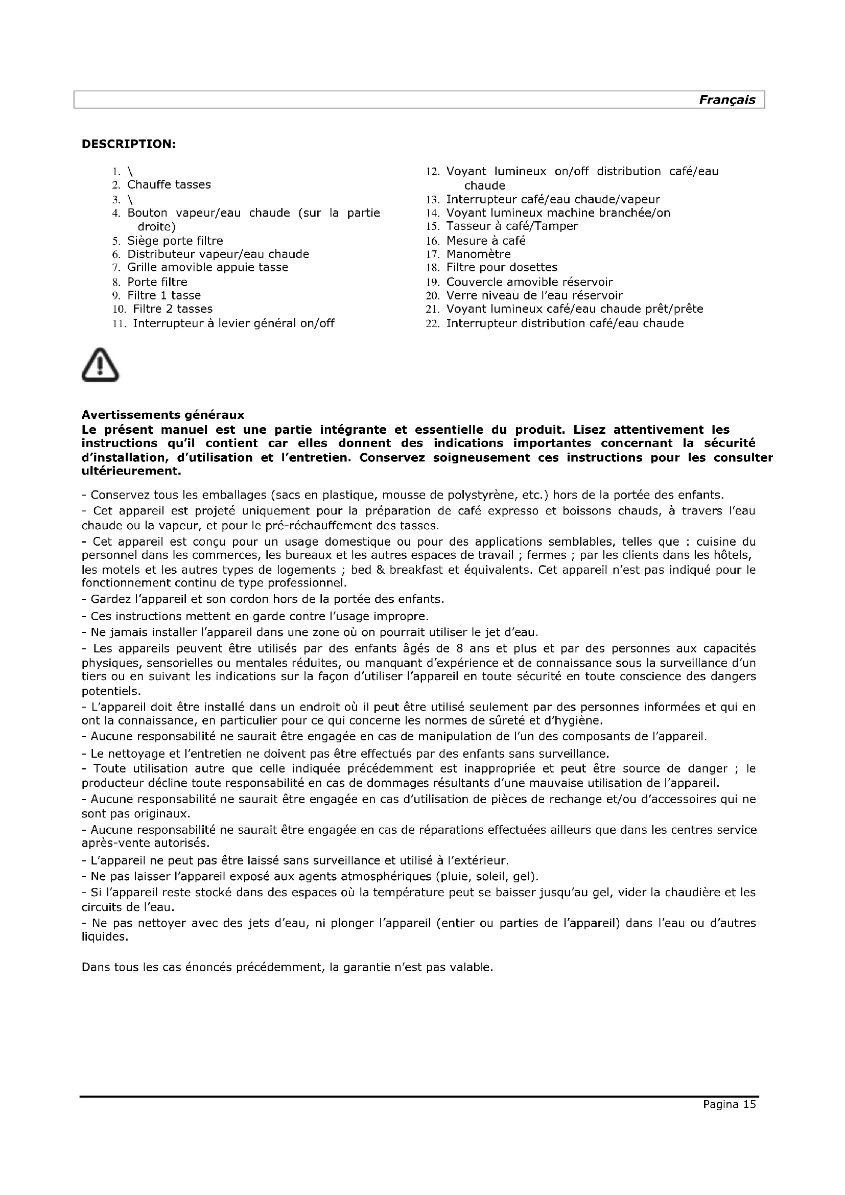 Avertissements généraux Le présent manuel est une partie intégrante et essentielle du produit. Lisez attentivement les instructions qu’il contient car elles donnent des indications importantes concernant la sécurité d’installation, d’utilisation et l’entretien. Conservez soigneusement ces instructions pour les consulter ultérieurement. - Conservez tous les emballages (sacs en plastique, mousse de polystyrène, etc.) hors de la portée des enfants. - Cet appareil est projeté uniquement pour la préparation de café expresso et boissons chauds, à travers l’eau chaude ou la vapeur, et pour le pré-réchauffement des tasses. - Cet appareil est conçu pour un usage domestique ou pour des applications semblables, telles que : cuisine du personnel dans les commerces, les bureaux et les autres espaces de travail ; fermes ; par les clients dans les hôtels, les motels et les autres types de logements ; bed & breakfast et équivalents. Cet appareil n’est pas indiqué pour le fonctionnement continu de type professionnel. - Gardez l’appareil et son cordon hors de la portée des enfants. - Ces instructions mettent en garde contre l’usage impropre. - Ne jamais installer l’appareil dans une zone où on pourrait utiliser le jet d’eau. - Les appareils peuvent être utilisés par des enfants âgés de 8 ans et plus et par des personnes aux capacités physiques, sensorielles ou mentales réduites, ou manquant d’expérience et de connaissance sous la surveillance d’un tiers ou en suivant les indications sur la façon d’utiliser l’appareil en toute sécurité en toute conscience des dangers potentiels. - L’appareil doit être installé dans un endroit où il peut être utilisé seulement par des personnes informées et qui en ont la connaissance, en particulier pour ce qui concerne les normes de sûreté et d’hygiène. - Aucune responsabilité ne saurait être engagée en cas de manipulation de l’un des composants de l’appareil. - Le nettoyage et l’entretien ne doivent pas être effectués par des enfants sans surveillance. - Toute utilisation autre que celle indiquée précédemment est inappropriée et peut être source de danger ; le producteur décline toute responsabilité en cas de dommages résultants d’une mauvaise utilisation de l’appareil. - Aucune responsabilité ne saurait être engagée en cas d’utilisation de pièces de rechange et/ou d’accessoires qui ne sont pas originaux. - Aucune responsabilité ne saurait être engagée en cas de réparations effectuées ailleurs que dans les centres service après-vente autorisés. - L’appareil ne peut pas être laissé sans surveillance et utilisé à l’extérieur. - Ne pas laisser l’appareil exposé aux agents atmosphériques (pluie, soleil, gel). - Si l’appareil reste stocké dans des espaces où la température peut se baisser jusqu’au gel, vider la chaudière et les circuits de l’eau. - Ne pas nettoyer avec des jets d’eau, ni plonger l’appareil (entier ou parties de l’appareil) dans l’eau ou d’autres liquides. Dans tous les cas énoncés précédemment, la garantie n’est pas valable.Pagina 16 Français