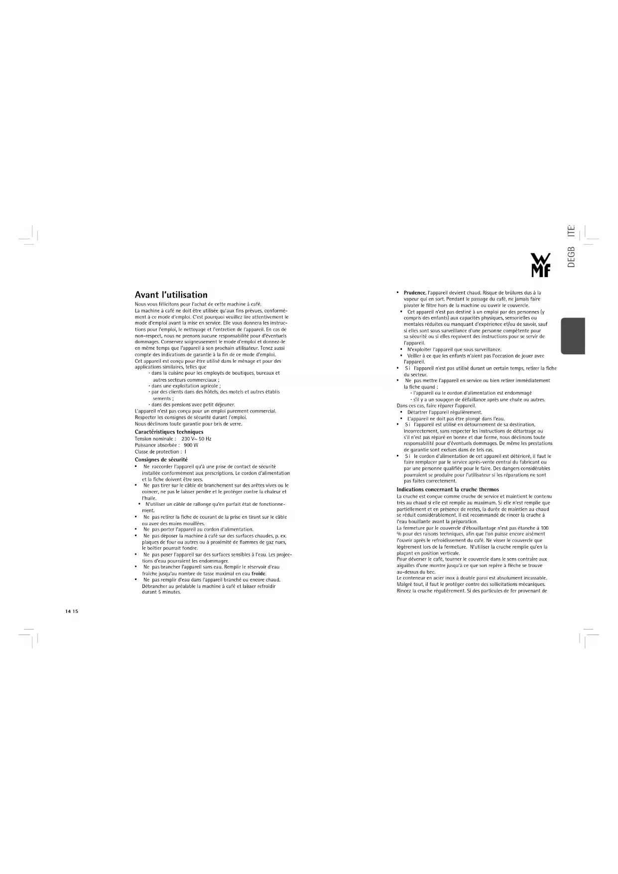 - Never use the plug without closing the fuse cover. The appliance is compliant with European Directives 2006/95/EC, 2004/108/EC and 2009/125/EC. This product may not be disposed of in normal household waste at the end of its service life, but must be delivered to a collecting point for recycling electrical and electronic appliances. The materials are reusable in accordance with their identification. You will make an important contribution to the protection of our environ- ment by recycling used appliances. Please ask about the responsible disposal point at your community offices. Subject to change Universal Express Decalcifier durgol® universal durgol® universal quickly and simply removes limescale and calcium deposits from all household items. Its formula stands for efficient decalcifying which is at the same gentle on materials, food-compatible and environmentally friendly. durgol® universal can be purchased at select dealers or directly from wmf consumer electric in a 500 litre bottle.14 15 DEGBFRITESNLDASVFINO Avant l‘utilisation Nous vous félicitons pour l‘achat de cette machine à café. La machine à café ne doit être utilisée qu‘aux fins prévues, conformé- ment à ce mode d‘emploi. C’est pourquoi veuillez lire attentivement le mode d‘emploi avant la mise en service. Elle vous donnera les instruc- tions pour l’emploi, le nettoyage et l’entretien de l’appareil. En cas de non-respect, nous ne prenons aucune responsabilité pour d‘éventuels dommages. Conservez soigneusement le mode d’emploi et donnez-le en même temps que l’appareil à son prochain utilisateur. Tenez aussi compte des indications de garantie à la fin de ce mode d’emploi. Cet appareil est conçu pour être utilisé dans le ménage et pour des applications similaires, telles que ⋅ dans la cuisine pour les employés de boutiques, bureaux et autres secteurs commerciaux ; ⋅ dans une exploitation agricole ; ⋅ par des clients dans des hôtels, des motels et autres établis sements ; ⋅ dans des pensions avec petit déjeuner. L‘appareil n‘est pas conçu pour un emploi purement commercial. Respecter les consignes de sécurité durant l‘emploi. Nous déclinons toute garantie pour bris de verre. Caractéristiques techniques Tension nominale : 230 V~ 50 Hz Puissance absorbée : 900 W Classe de protection : I Consignes de sécurité