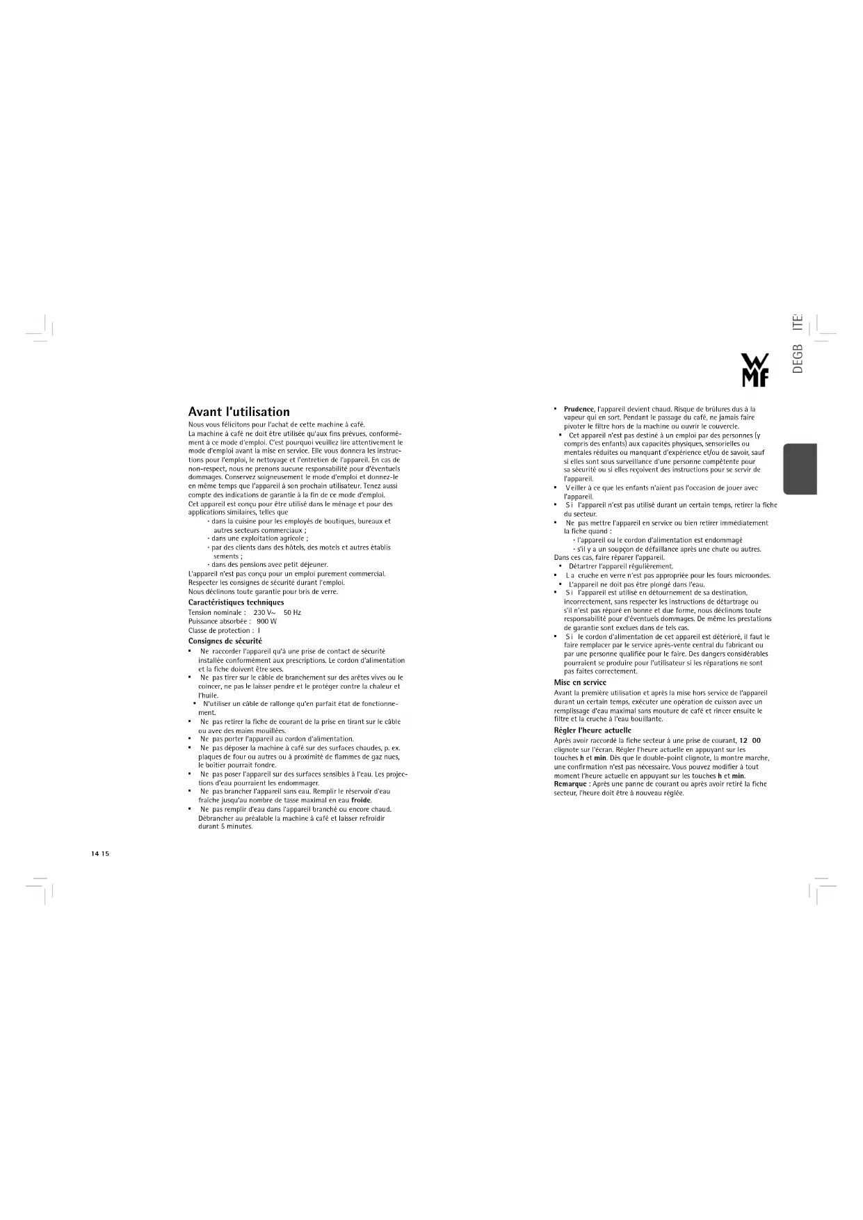 - Never use the plug without closing the fuse cover. The appliance is compliant with European Directives 2006/95/EC, 2004/108/EC and 2009/125/EC. This product may not be disposed of in normal household waste at the end of its service life, but must be delivered to a collecting point for recycling electrical and electronic appliances. The materials are reusable in accordance with their identification. You will make an important contribution to the protection of our environ- ment by recycling used appliances. Please ask about the responsible disposal point at your community offices. Subject to change Universal Express Decalcifier durgol® universal durgol® universal quickly and simply removes limescale and calcium deposits from all household items. Its formula stands for efficient decalcifying which is at the same gentle on materials, food-compatible and environmentally friendly. durgol® universal can be purchased at select dealers or directly from wmf consumer electric in a 500 litre bottle.14 15 DEGBFRITESNLDASVFINO Avant l‘utilisation Nous vous félicitons pour l‘achat de cette machine à café. La machine à café ne doit être utilisée qu‘aux fins prévues, conformé- ment à ce mode d‘emploi. C’est pourquoi veuillez lire attentivement le mode d‘emploi avant la mise en service. Elle vous donnera les instruc- tions pour l’emploi, le nettoyage et l’entretien de l’appareil. En cas de non-respect, nous ne prenons aucune responsabilité pour d‘éventuels dommages. Conservez soigneusement le mode d’emploi et donnez-le en même temps que l’appareil à son prochain utilisateur. Tenez aussi compte des indications de garantie à la fin de ce mode d’emploi. Cet appareil est conçu pour être utilisé dans le ménage et pour des applications similaires, telles que ⋅ dans la cuisine pour les employés de boutiques, bureaux et autres secteurs commerciaux ; ⋅ dans une exploitation agricole ; ⋅ par des clients dans des hôtels, des motels et autres établis sements ; ⋅ dans des pensions avec petit déjeuner. L‘appareil n‘est pas conçu pour un emploi purement commercial. Respecter les consignes de sécurité durant l‘emploi. Nous déclinons toute garantie pour bris de verre. Caractéristiques techniques Tension nominale : 230 V~ 50 Hz Puissance absorbée : 900 W Classe de protection : I Consignes de sécurité