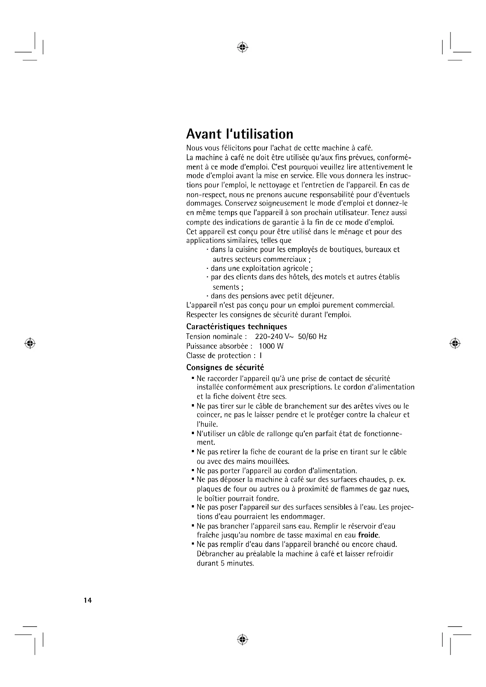- Never use the plug without closing the fuse cover.13 DEGBFRITESNLDASVFINO The appliance is compliant with European Directives 2006/95/EC, 2004/108/EC and 2009/125/EC. This product may not be disposed of in normal household waste at the end of its service life, but must be delivered to a collecting point for recycling electrical and electronic appliances. The materials are reusable in accordance with their identification. You will make an important contribution to the protection of our environ- ment by recycling used appliances. Please ask about the responsible disposal point at your community offices. Subject to change Universal Express Decalcifier durgol® universal durgol® universal quickly and simply removes limescale and calcium deposits from all household items. Its formula stands for efficient decalcifying which is at the same gentle on materials, food-compatible and environmentally friendly. durgol® universal can be purchased at select dealers or directly from wmf consumer electric in a 500 litre bottle.14 Avant l‘utilisation Nous vous félicitons pour l‘achat de cette machine à café. La machine à café ne doit être utilisée qu‘aux fins prévues, conformé- ment à ce mode d‘emploi. C’est pourquoi veuillez lire attentivement le mode d‘emploi avant la mise en service. Elle vous donnera les instruc- tions pour l’emploi, le nettoyage et l’entretien de l’appareil. En cas de non-respect, nous ne prenons aucune responsabilité pour d‘éventuels dommages. Conservez soigneusement le mode d’emploi et donnez-le en même temps que l’appareil à son prochain utilisateur. Tenez aussi compte des indications de garantie à la fin de ce mode d’emploi. Cet appareil est conçu pour être utilisé dans le ménage et pour des applications similaires, telles que ⋅ dans la cuisine pour les employés de boutiques, bureaux et autres secteurs commerciaux ; ⋅ dans une exploitation agricole ; ⋅ par des clients dans des hôtels, des motels et autres établis sements ; ⋅ dans des pensions avec petit déjeuner. L‘appareil n‘est pas conçu pour un emploi purement commercial. Respecter les consignes de sécurité durant l‘emploi. Caractéristiques techniques Tension nominale : 220-240 V~ 50/60 Hz Puissance absorbée : 1000 W Classe de protection : I Consignes de sécurité