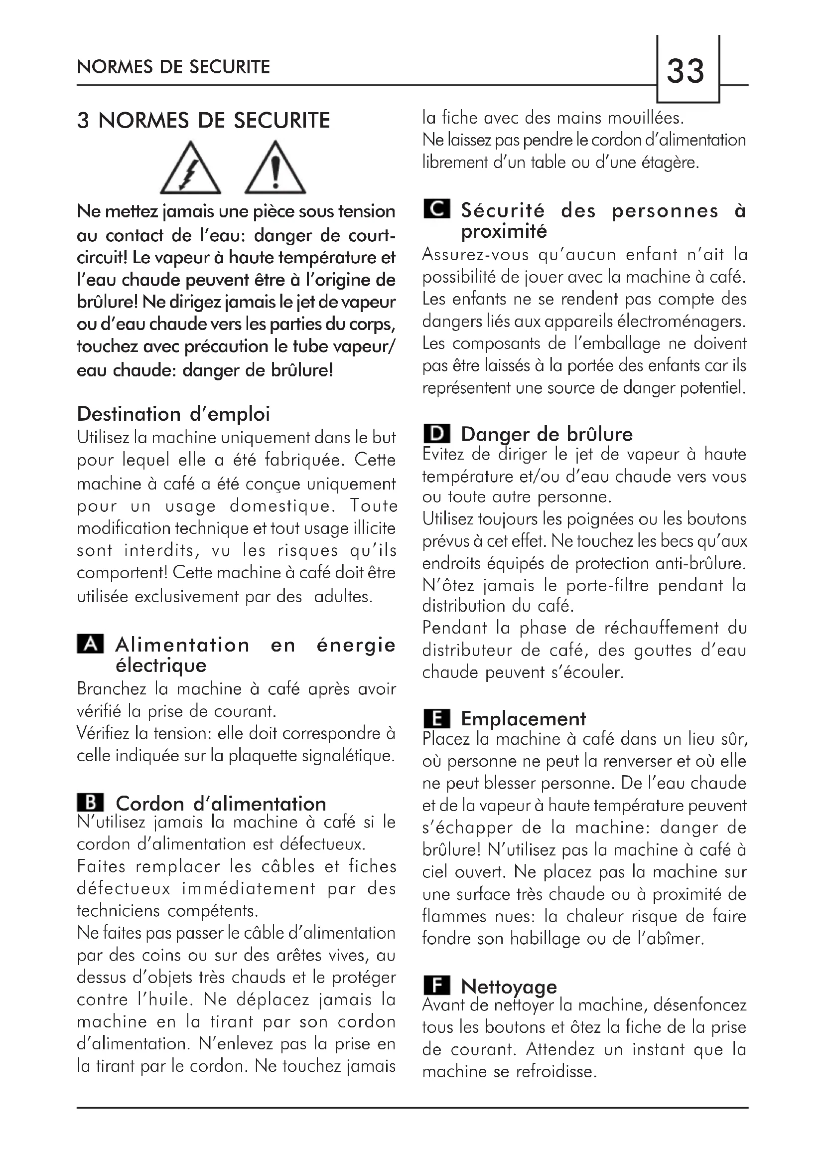 Ne mettez jamais une pièce sous tension au contact de l’eau: danger de court- circuit! Le vapeur à haute température et l’eau chaude peuvent être à l’origine de brûlure! Ne dirigez jamais le jet de vapeur ou d’eau chaude vers les parties du corps, touchez avec précaution le tube vapeur/ eau chaude: danger de brûlure! Destination d’emploi Utilisez la machine uniquement dans le but pour lequel elle a été fabriquée. Cette machine à café a été conçue uniquement pour un usage domestique. Toute modification technique et tout usage illicite sont interdits, vu les risques qu’ils comportent! Cette machine à café doit être utilisée exclusivement par des adultes. Alimentation en énergie électrique Branchez la machine à café après avoir vérifié la prise de courant. Vérifiez la tension: elle doit correspondre à celle indiquée sur la plaquette signalétique. Cordon d’alimentation N’utilisez jamais la machine à café si le cordon d’alimentation est défectueux. Faites remplacer les câbles et fiches défectueux immédiatement par des techniciens compétents. Ne faites pas passer le câble d’alimentation par des coins ou sur des arêtes vives, au dessus d’objets très chauds et le protéger contre l’huile. Ne déplacez jamais la machine en la tirant par son cordon d’alimentation. N’enlevez pas la prise en la tirant par le cordon. Ne touchez jamais la fiche avec des mains mouillées. Ne laissez pas pendre le cordon d’alimentation librement d’un table ou d’une étagère. Sécurité des personnes à proximité Assurez-vous qu’aucun enfant n’ait la possibilité de jouer avec la machine à café. Les enfants ne se rendent pas compte des dangers liés aux appareils électroménagers. Les composants de l’emballage ne doivent pas être laissés à la portée des enfants car ils représentent une source de danger potentiel. Danger de brûlure Evitez de diriger le jet de vapeur à haute température et/ou d’eau chaude vers vous ou toute autre personne. Utilisez toujours les poignées ou les boutons prévus à cet effet. Ne touchez les becs qu’aux endroits équipés de protection anti-brûlure. N’ôtez jamais le porte-filtre pendant la distribution du café. Pendant la phase de réchauffement du distributeur de café, des gouttes d’eau chaude peuvent s’écouler. Emplacement Placez la machine à café dans un lieu sûr, où personne ne peut la renverser et où elle ne peut blesser personne. De l’eau chaude et de la vapeur à haute température peuvent s’échapper de la machine: danger de brûlure! N’utilisez pas la machine à café à ciel ouvert. Ne placez pas la machine sur une surface très chaude ou à proximité de flammes nues: la chaleur risque de faire fondre son habillage ou de l’abîmer. Nettoyage Avant de nettoyer la machine, désenfoncez tous les boutons et ôtez la fiche de la prise de courant. Attendez un instant que la machine se refroidisse.34