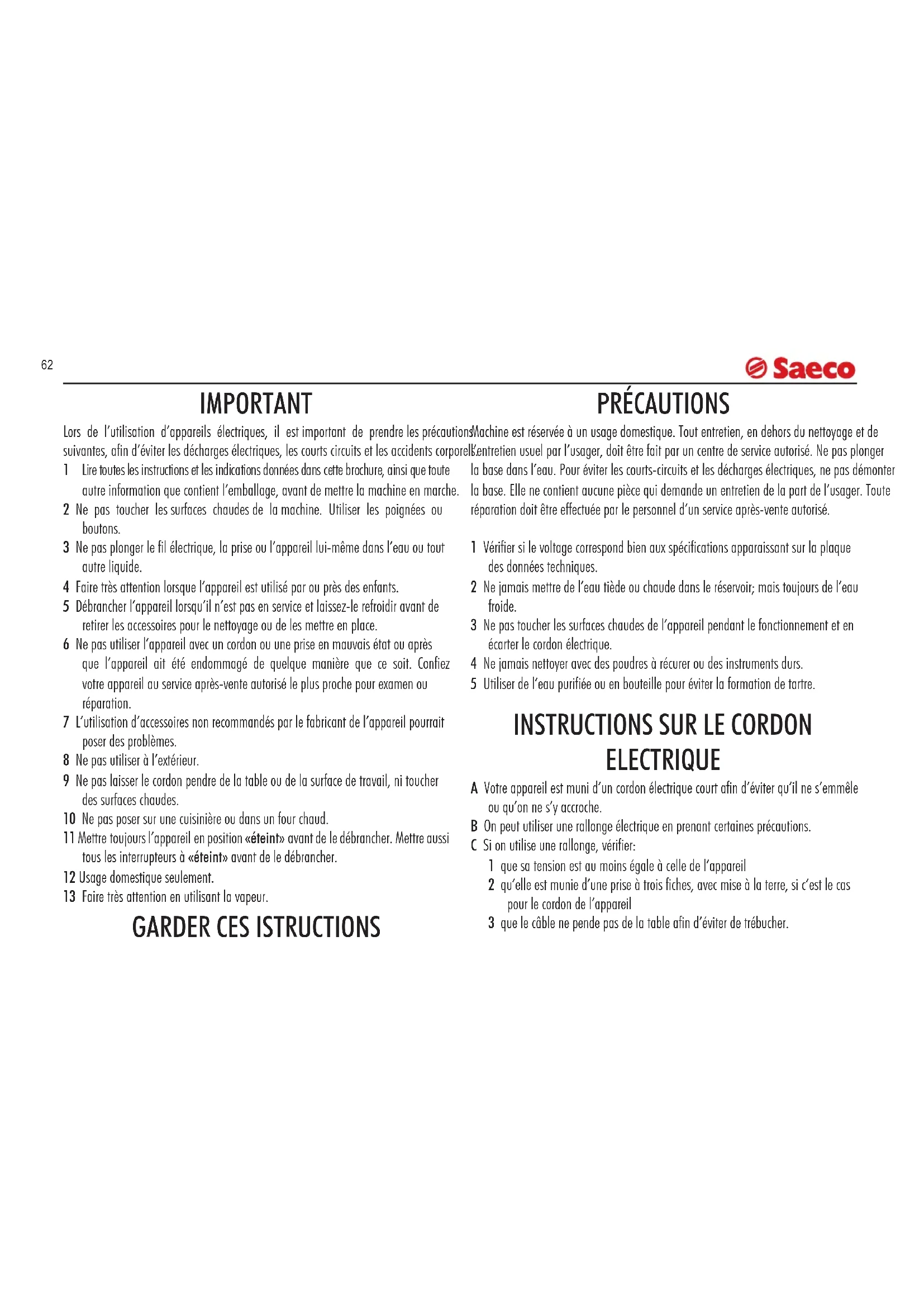 Zu wenig oder keine Kaffeeausgabe Drehknopf nach rechts gedreht. Mahlung zu fein oder SBS. Mahlung auf einen höheren Wert einstellen (Drehknopf im Uhrzeigersinn drehen). SBS-Drehknopf nach links drehen. DEUTSCH 61IMPORTANT Lors de l’utilisation d’appareils électriques, il est important de prendre les précautions suivantes, afin d’éviter les décharges électriques, les courts circuits et les accidents corporels. 1 Lire toutes les instructions et les indications données dans cette brochure, ainsi que toute autre information que contient l’emballage, avant de mettre la machine en marche. 2 Ne pas toucher les surfaces chaudes de la machine. Utiliser les poignées ou boutons. 3 Ne pas plonger le fil électrique, la prise ou l’appareil lui-même dans l’eau ou tout autre liquide. 4 Faire très attention lorsque l’appareil est utilisé par ou près des enfants. 5 Débrancher l’appareil lorsqu’il n’est pas en service et laissez-le refroidir avant de retirer les accessoires pour le nettoyage ou de les mettre en place. 6 Ne pas utiliser l’appareil avec un cordon ou une prise en mauvais état ou après que l’appareil ait été endommagé de quelque manière que ce soit. Confiez votre appareil au service après-vente autorisé le plus proche pour examen ou réparation. 7 L’utilisation d’accessoires non recommandés par le fabricant de l’appareil pourrait poser des problèmes. 8 Ne pas utiliser à l’extérieur. 9 Ne pas laisser le cordon pendre de la table ou de la surface de travail, ni toucher des surfaces chaudes. 10 Ne pas poser sur une cuisinière ou dans un four chaud. 11 Mettre toujours l’appareil en position «éteint» avant de le débrancher. Mettre aussi tous les interrupteurs à «éteint» avant de le débrancher. 12 Usage domestique seulement. 13 Faire très attention en utilisant la vapeur.