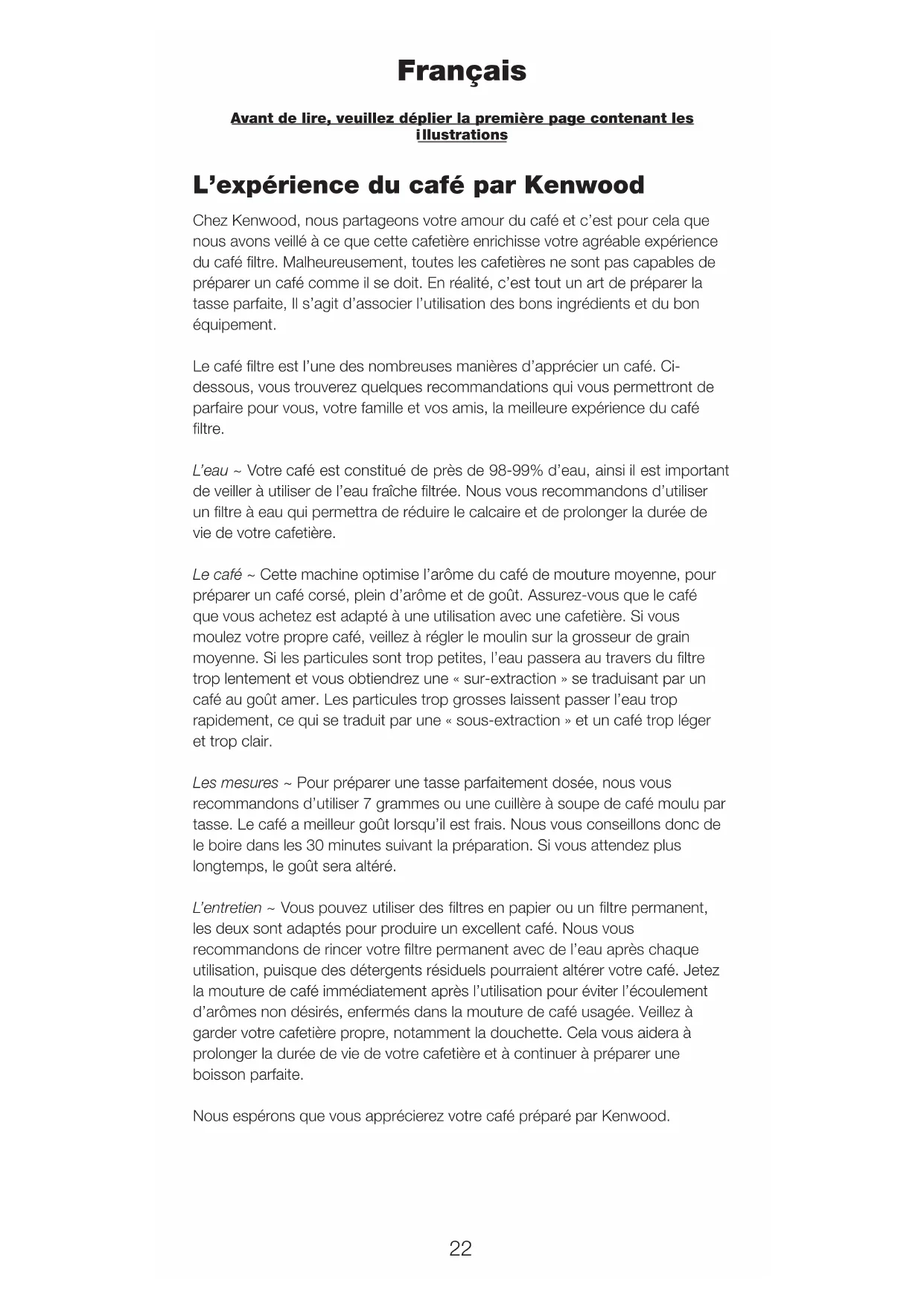 u café filtre. Malheureusement, toutes les cafetières ne sont pas capables de préparer un café comme il se doit. En réalité, c’est tout un art de préparer la tasse parfaite, Il s’agit d’associer l’utilisation des bons ingrédients et du bon équipement. Le café filtre est l’une des nombreuses manières d’apprécier un café. Ci- dessous, vous trouverez quelques recommandations qui vous permettront de parfaire pour vous, votre famille et vos amis, la meilleure expérience du café filtre. L’eau ~ Votre café est constitué de près de 98-99% d’eau, ainsi il est important de veiller à utiliser de l’eau fraîche filtrée. Nous vous recommandons d’utiliser un filtre à eau qui permettra de réduire le calcaire et de prolonger la durée de vie de votre cafetière. Le café ~ Cette machine optimise l’arôme du café de mouture moyenne, pour préparer un café corsé, plein d’arôme et de goût. Assurez-vous que le café que vous achetez est adapté à une utilisation avec une cafetière. Si vous moulez votre propre café, veillez à régler le moulin sur la grosseur de grain moyenne. Si les particules sont trop petites, l’eau passera au travers du filtre trop lentement et vous obtiendrez une « sur-extraction » se traduisant par un café au goût amer. Les particules trop grosses laissent passer l’eau trop rapidement, ce qui se traduit par une « sous-extraction » et un café trop léger et trop clair. Les mesures ~ Pour préparer une tasse parfaitement dosée, nous vous recommandons d’utiliser 7 grammes ou une cuillère à soupe de café moulu par tasse. Le café a meilleur goût lorsqu’il est frais. Nous vous conseillons donc de le boire dans les 30 minutes suivant la préparation. Si vous attendez plus longtemps, le goût sera altéré. L’entretien ~ Vous pouvez utiliser des filtres en papier ou un filtre permanent, les deux sont adaptés pour produire un excellent café. Nous vous recommandons de rincer votre filtre permanent avec de l’eau après chaque utilisation, puisque des détergents résiduels pourraient altérer votre café. Jetez la mouture de café immédiatement après l’utilisation pour éviter l’écoulement d’arômes non désirés, enfermés dans la mouture de café usagée. Veillez à garder votre cafetière propre, notamment la douchette. Cela vous aidera à prolonger la durée de vie de votre cafetière et à continuer à préparer une boisson parfaite. Nous espérons que vous apprécierez votre café préparé par Kenwood. Français