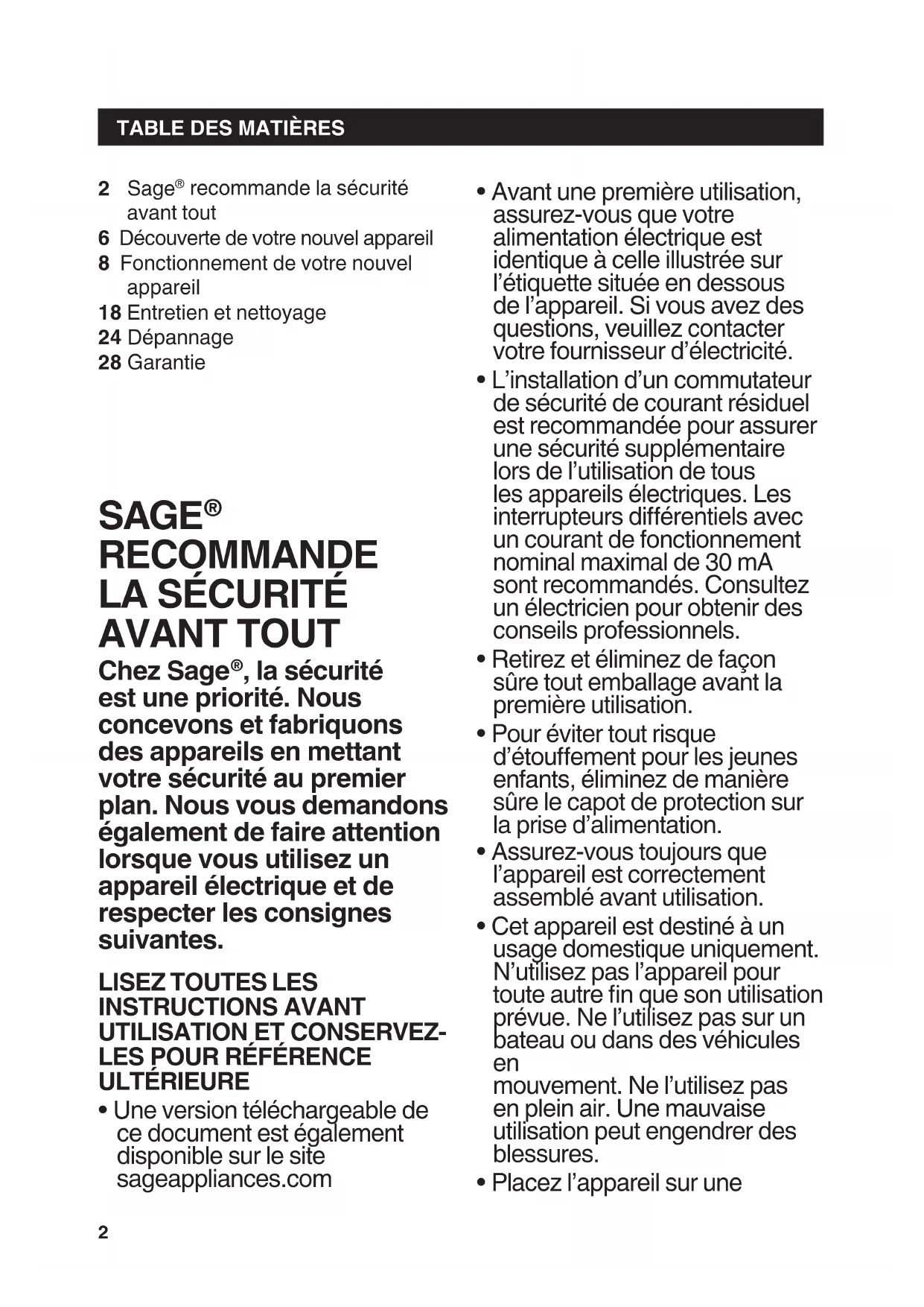 recommande la sécurité avant tout 6 Découverte de votre nouvel appareil 8 Fonctionnement de votre nouvel appareil 18 Entretien et nettoyage 24 Dépannage 28 Garantie SAGE
