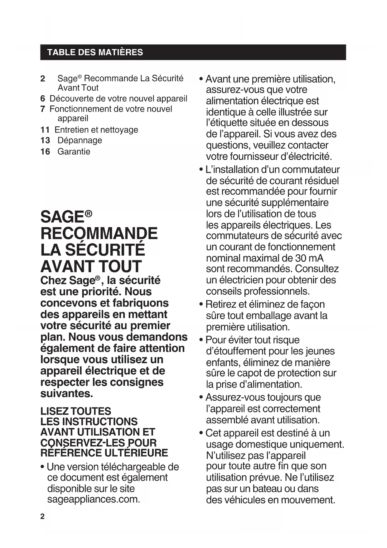 - Une version téléchargeable de ce document est également disponible sur le site sageappliances.com.