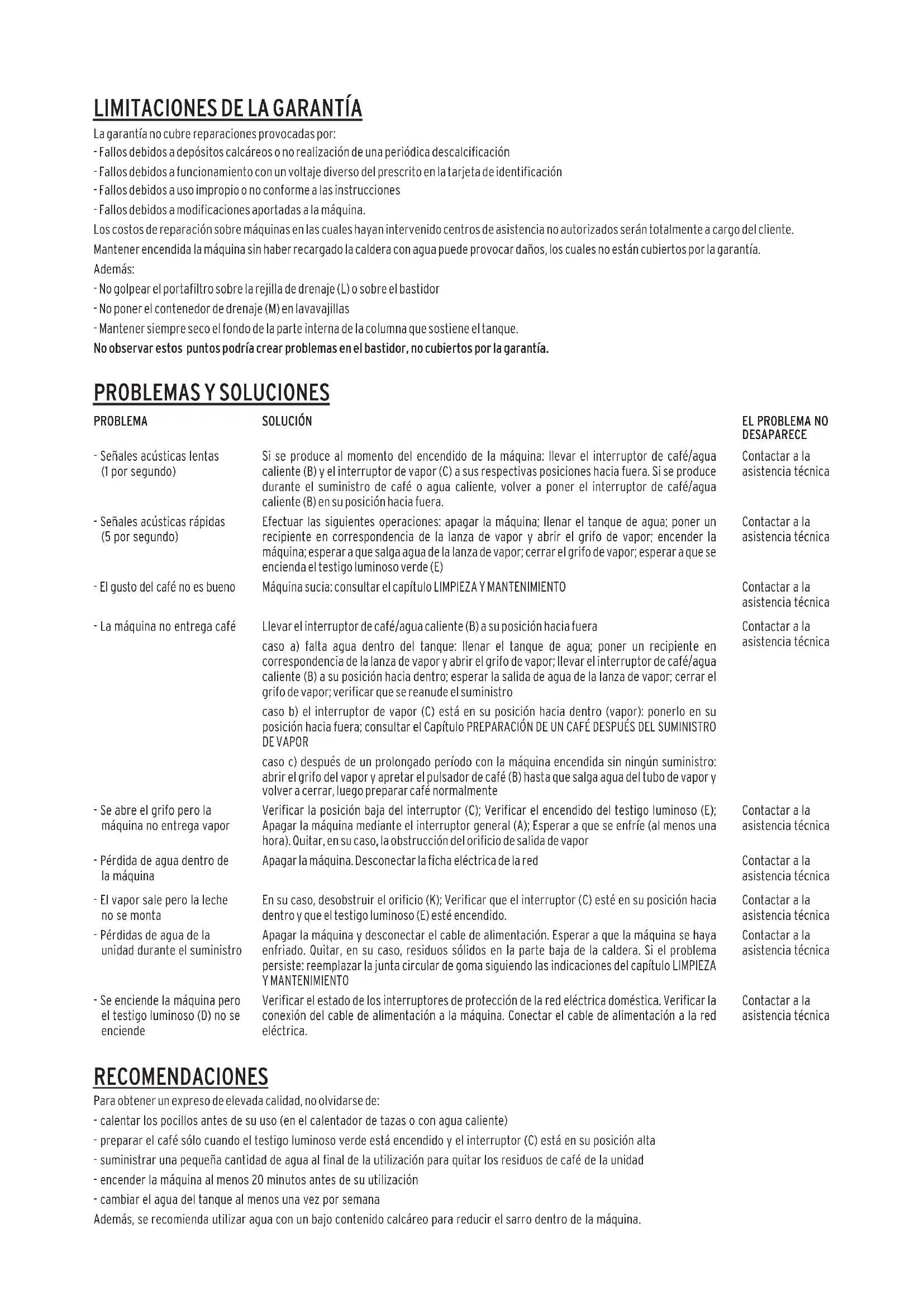 - Impulsions acoustique lentes (1 par seconde) - Impulsions acoustiques rapides (5 par seconde) - Le café a un mauvais goût - La machine ne distribue pas de café - Vous ouvrez le robinet et la machine ne débite pas de vapeur - Fuite d'eau à l'intérieur de la machine - La vapeur sort mais le lait ne monte pas - Pertes d'eau du groupe pendant le débit - Vous allumez la machine mais la lampe témoin (D) ne s'allume pas PROBLÈME Contacter l'assistance Contacter l'assistance Contacter l'assistance Contacter l'assistance Contacter l'assistance Contacter l'assistance Contacter l'assistance Contacter l'assistance Contacter l'assistance PERSISTANCE DU