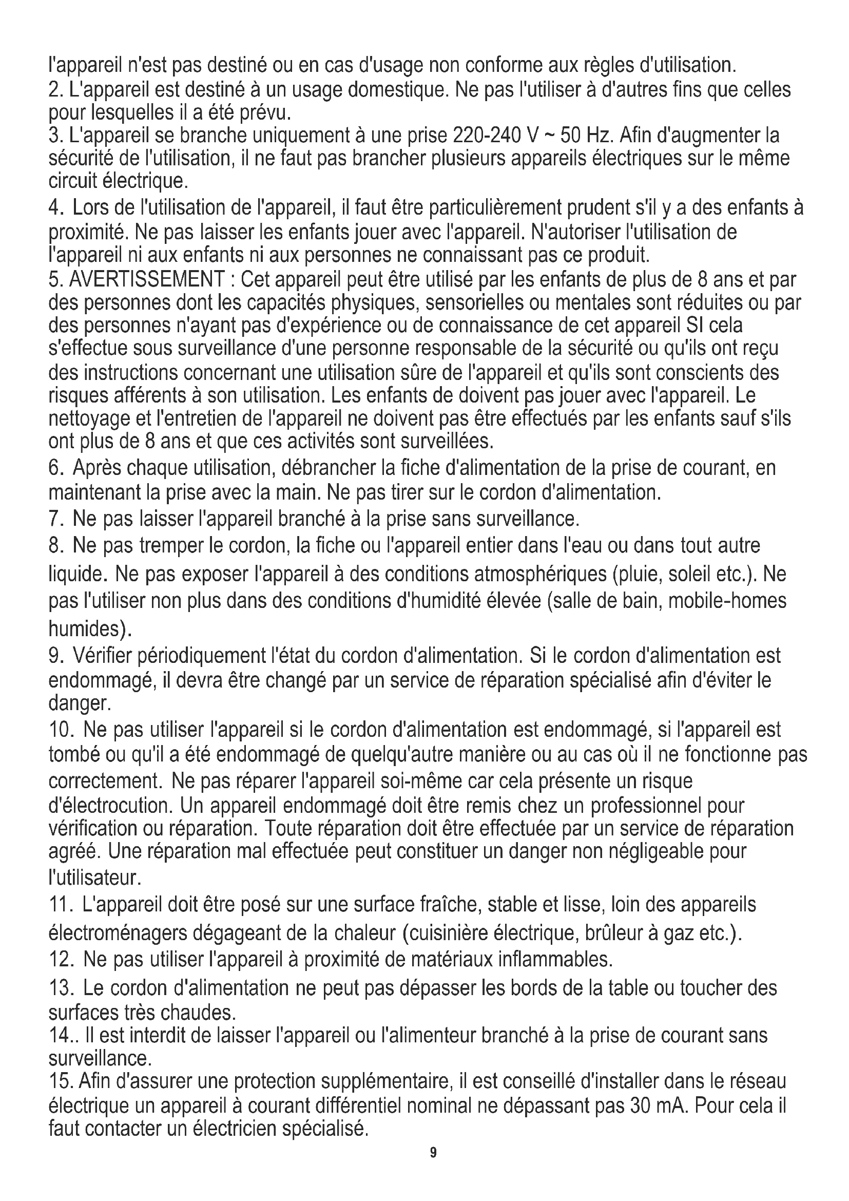 - L'appareil se branche uniquement à une prise 220-240 V ~ 50 Hz. Afin d'augmenter la sécurité de l'utilisation, il ne faut pas branchier plusieurs apparéils électriques sur le même circuit électrique.