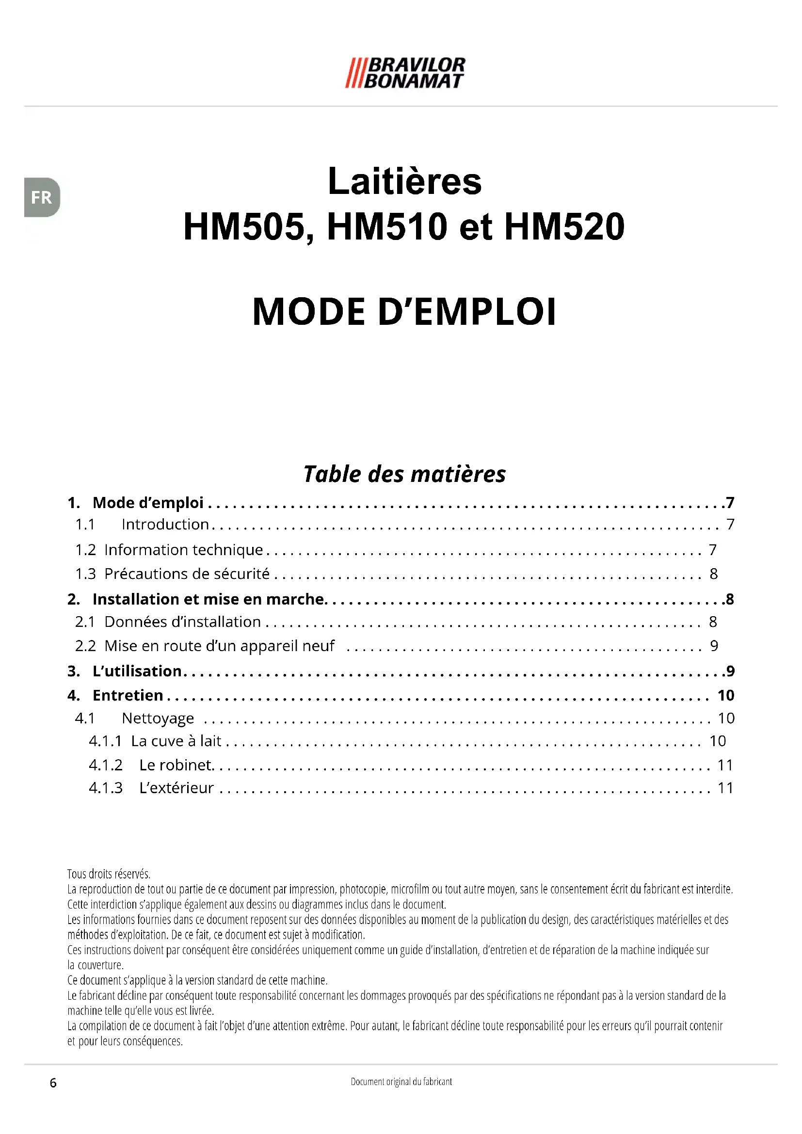MODE D'EMPLOI HM520 Bravilor Bonamat