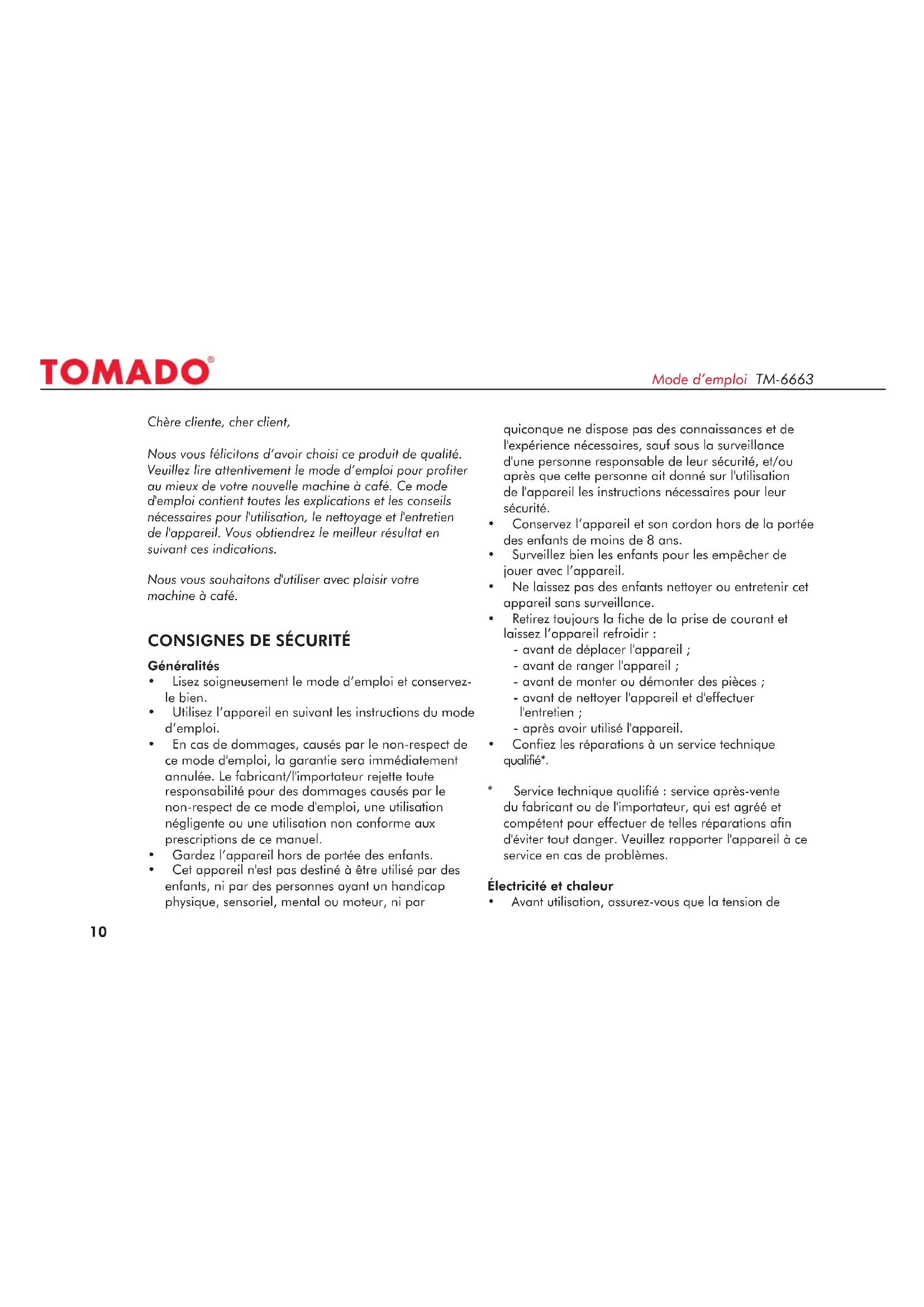 - Aprèsledétartrage,allumezlamachineàcaféavec unréservoird'eaupleinetsanscafémoulu,selon laprocéduredécritedanslasection«Utilisation». Lesrestesdecalcaireetlesrestesduproduitde détartrageserontainsisupprimés. RANGEMENT Rangezl’appareildansunendroitsec. DONNÉES TECHNIQuES TM-6663 Puissance: 730-870W Tension: 230V/50Hz Mode d’emploi TM-666316 Nousvousfélicitonsdevotreachatdecetappareilde l’assortimentTOMADO. Conditions de garantie