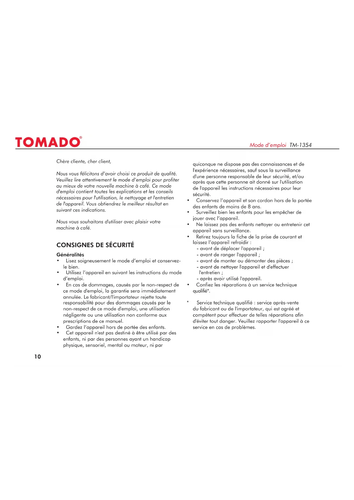TM1354 - Machine à café Tomado - Notice d'utilisation et mode d'emploi gratuit