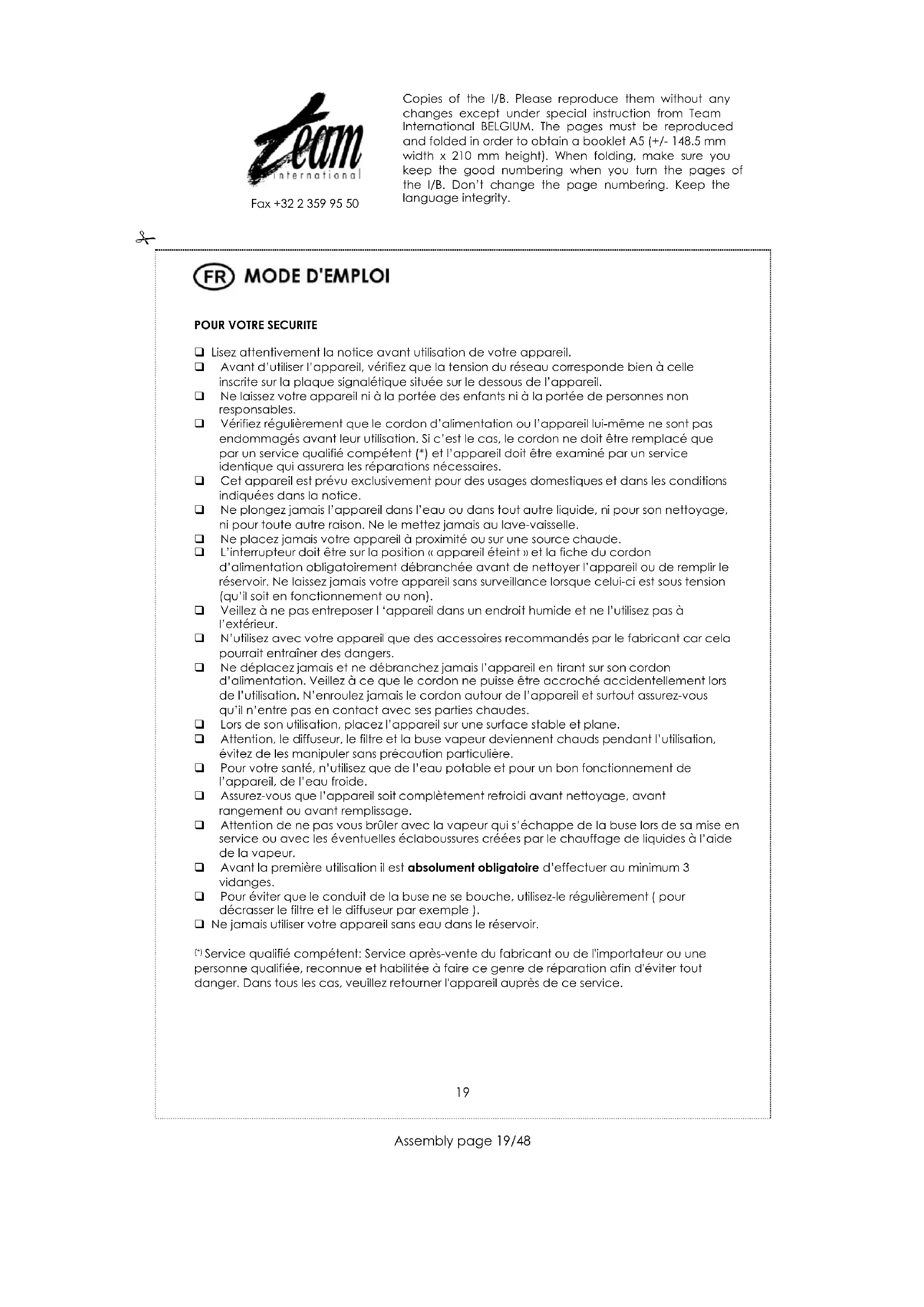 Lisez attentivement la notice avant utilisation de votre appareil. Avant d'utiliser l'appareil, vérifiez que la tension du réseau corresponde bien à celle inscrite sur la plaque signalétique située sur le dessous de l'appareil. Ne laissez aucun appareil ni à la portée des enfants ni à la portée de personnes non responsables. Vérifiez régulièrement que le cordon d'alimentation ou l'appareil lui-même ne sont pas endommagés avant leur utilisation. Si c'est le cas, le cordon ne doit être remplacé que par un service qualifié compétent (*) et l'appareil doit être examiné par un service identique qui assurera les réparations nécessaires. Cet appareil est prévu exclusivement pour des usages domestiques et dans les conditions indiquées dans la notice. Ne plongez jamais l'appareil dans l'eau ou dans tout autre liquide, ni pour son nettoyage, ni pour toute autre raison. Ne le mettez jamais au lave-vaiselle. Ne placez jamais votre appareil à proximité ou sur une source chaude. L'interrupteur doit être sur la position « appareil éteint » et la fiche du cordon d'alimentation obligatoirement débranchée avant de nettoyer l'appareil ou de remplir le réservoir. Ne laissez jamais votre appareil sans surveillance lorsque celui-ci est sous tension (qu'il soit en fonctionnement ou non). Veillez à ne pas entreposer l'appareil dans un endroit humide et ne l'utilisez pas à l'extérieur. N'utilisez avec votre appareil que des accessoires recommandés par le fabricant car cela pourrait entraîner des dangers. Ne déplacez jamais et ne débranchez jamais l'appareil en tirant sur son cordon d'alimentation. Veillez à ce que le cordon ne puisse être accroché accidentellement lors de l'utilisation. N'enroulez jamais le cordon autour de l'appareil et sur tout assurez-vous qu'il n'entre pas en contact avec ses parties chaudes. Lors de son utilisation, placez l'appareil sur une surface stable et plane. Attention, le diffuseur, le filtre et la buse vapeur deviennent chauds pendant l'utilisation, évitez de les manipuler sans précaution particulière. Pour votre santé, n'utilisez que de l'eau potable et pour un bon fonctionnement de l'appareil, de l'eau froide. Assurez-vous que l'appareil soit complètement refroidi avant nettoyage, avant rangement ou avant remplissage. Attention de ne pas vous brûler avec la vapeur qui s'échappe de la buse lors de sa mise en service ou avec les éventuelles éclaboussures créées par le chauffage de liquides à l'aide de la vapeur. Avant la première utilisation il est absolument obligatoire d'effectuer au minimum 3 vidanges. Pour éviter que le conduit de la buse ne se bouche, utilisez-le régulièrement (pour décrasser le filtre et le diffuseur par exemple). Ne jamais utiliser votre appareil sans eau dans le réservoir.