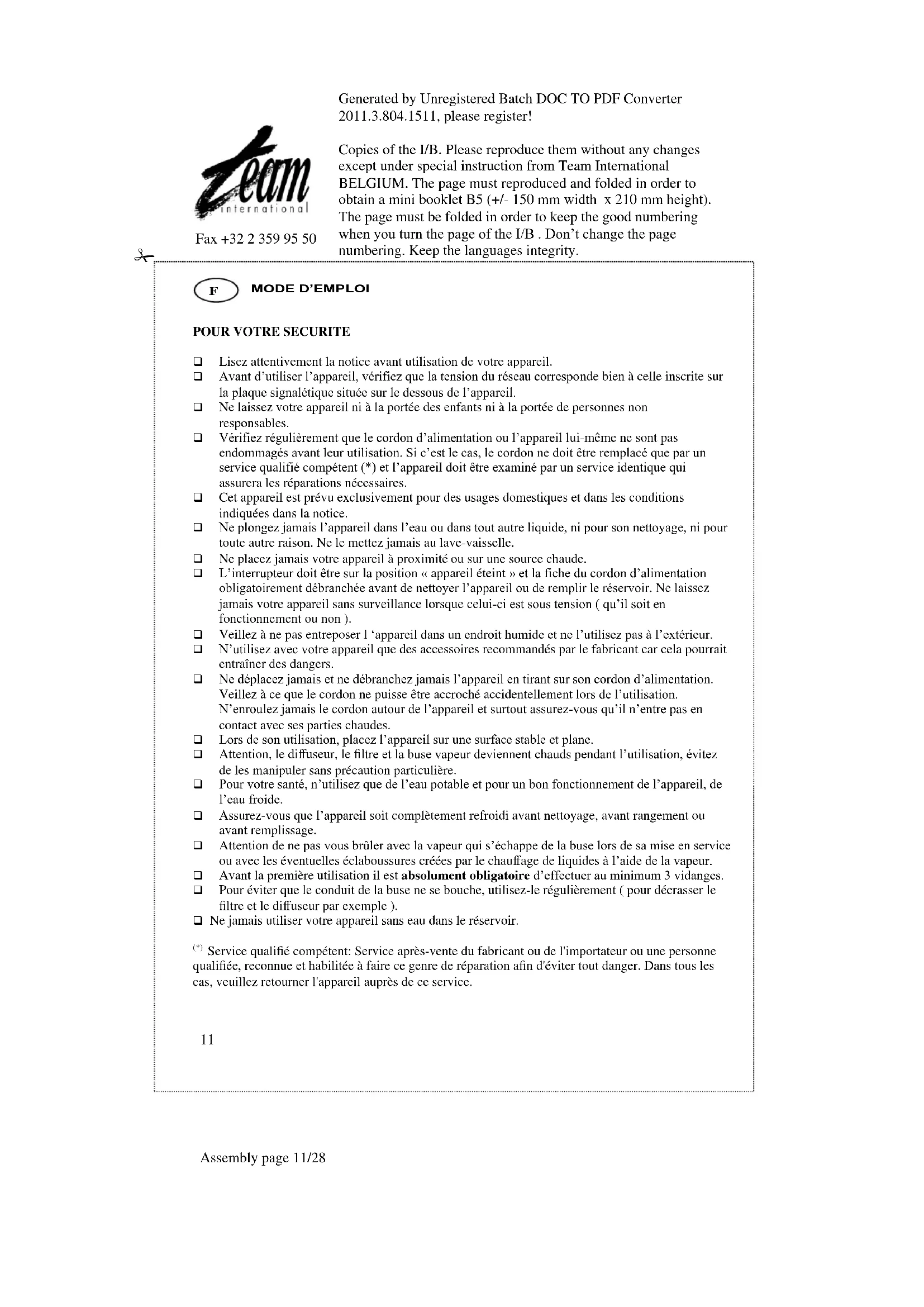 Vérifiez régulierement que le cordon d'alimentation ou l'appareil lui-même ne sont pas endommages avant leur utilisation. Si c'est le cas, le cordon ne doit être remplaceé que par un service qualifié compétent (*) et l'appareil doit être examé par un service identique qui assurera les réparations nécessaires.
