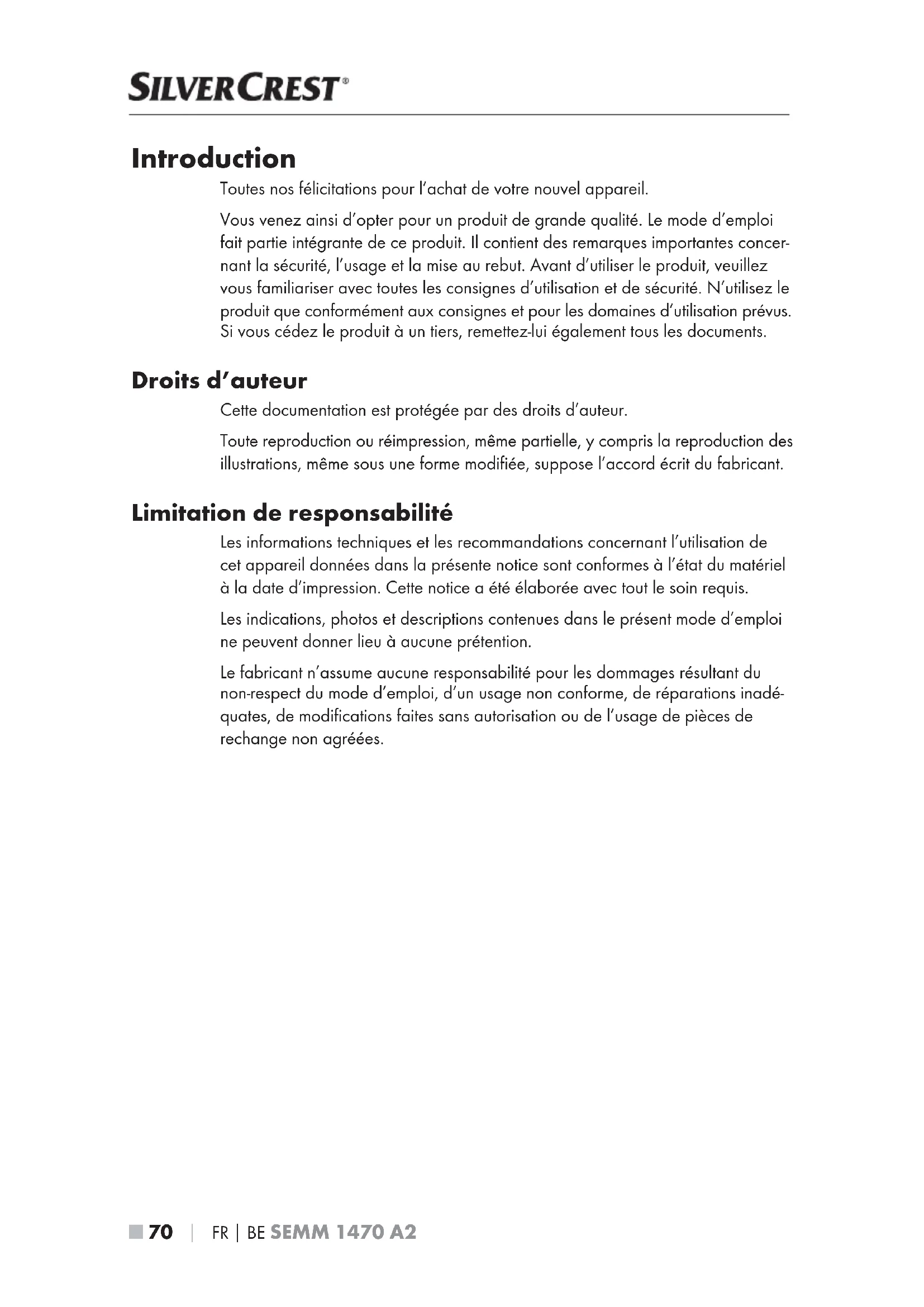 Introduction Toutes nos félicitations pour l’achat de votre nouvel appareil. Vous venez ainsi d’opter pour un produit de grande qualité. Le mode d’emploi fait partie intégrante de ce produit. Il contient des remarques importantes concer- nant la sécurité, l’usage et la mise au rebut. Avant d’utiliser le produit, veuillez vous familiariser avec toutes les consignes d’utilisation et de sécurité. N’utilisez le produit que conformément aux consignes et pour les domaines d’utilisation prévus. Si vous cédez le produit à un tiers, remettez-lui également tous les documents. Droits d’auteur Cette documentation est protégée par des droits d’auteur. Toute reproduction ou réimpression, même partielle, y compris la reproduction des illustrations, même sous une forme modifiée, suppose l’accord écrit du fabricant. Limitation de responsabilité Les informations techniques et les recommandations concernant l’utilisation de cet appareil données dans la présente notice sont conformes à l’état du matériel à la date d’impression. Cette notice a été élaborée avec tout le soin requis. Les indications, photos et descriptions contenues dans le présent mode d’emploi ne peuvent donner lieu à aucune prétention. Le fabricant n’assume aucune responsabilité pour les dommages résultant du non-respect du mode d’emploi, d’un usage non conforme, de réparations inadé- quates, de modifications faites sans autorisation ou de l’usage de pièces de rechange non agréées. IB_341821_SEMM1470A2_LB8.indb 70 05.05.2020 15:10:28FR