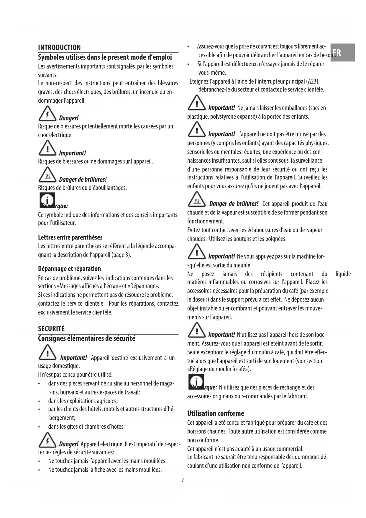 INTRODUCTION Symboles utilisés dans le présent mode d’emploi Les avertissements importants sont signalés par les symboles suivants. Le non-respect des instructions peut entraîner des blessures graves, des chocs électriques, des brûlures, un incendie ou en- dommager l’appareil. Danger! Risque de blessures potentiellement mortelles causées par un choc électrique. Important! Risques de blessures ou de dommages sur l’appareil. Danger de brûlures! Risques de brûlures ou d’ébouillantages. Remarque: Ce symbole indique des informations et des conseils importants pour l’utilisateur. Lettres entre parenthèses Les lettres entre parenthèses se réfèrent à la légende accompa- gnant la description de l’appareil (page 3). Dépannage et réparation En cas de problème, suivez les indications contenues dans les sections «Messages achés à l’écran» et «Dépannage». Si ces indications ne permettent pas de résoudre le problème, contactez le service clientèle. Pour les réparations, contactez exclusivement le service clientèle. SÉCURITÉ Consignes élémentaires de sécurité Important! Appareil destiné exclusivement à un usage domestique. Il n’est pas conçu pour être utilisé: