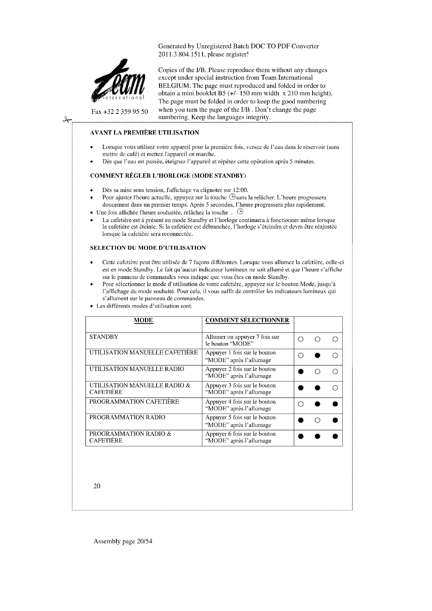 A partir du mode Standby, sélectionnez le mode en appuyant 4 fois sur le bouton “MODE”. L’indicateur lumineux central du panneau de commandes deviendra vert et l’indicateur lumineux de droite deviendra vert. Versez jusqu’à 1.4l d’eau froide dans le réservoir, et mettez un filtre papier dans le porte-filtre et remplissez-le avec la quantité de café moulu désirée. Mettez le porte-filtre à sa place en le faisant tourner jusqu’à ce que la flêche indique la position . Ensuite ajustez l'heure à laquelle la cafetière doit se mettre en marche en appuyant sur la touche sans la relâcher. L’heure de programmation progressera doucement dans un premier temps. Après 5 secondes, l’heure progressera plus rapidement. Une fois affichée l'heure souhaitée, relâchez la touche . Lorsque l’heure de programmation est atteinte, la cafetière se mettra en marche automatiquement et le petit témoin lumineux rouge s’allumera. La cafetière se coupera automatiquement après 1h45min de fonctionnement. A n’importe quel moment la cafetière peut être éteinte manuellement, en appuyant sur la touche I/O. L’appareil passera ainsi en mode Standby. Si vous souhaitez allumer la cafetière avant que la programmation ne débute, appuyez sur la touche I/O. L’appareil passera ainsi en mode UTILISATION MANUELLE CAFETIÈRE. Si à n’importe quel moment vous voulez contrôler l’heure de programmation, appuyer sur le bouton pendant 1 seconde et cette heure s’affichera. PROGRAMMATION RADIO A partir du mode Standby, sélectionnez le mode en appuyant 5 fois sur le bouton “MODE”. L’indicateur lumineux de gauche du panneau de commandes deviendra vert et l’indicateur lumineux de droite deviendra vert. Ajustez l'heure à laquelle la radio doit se mettre en marche en appuyant sur la touche sans la relâcher. L’heure de programmation progressera doucement dans un premier temps. Après 5 secondes, l’heure progressera plus rapidement. Une fois affichée l'heure souhaitée, relâchez la touche . Lorsque l’heure de programmation est atteinte, la radio se mettra en marche automatiquement et le petit témoin lumineux rouge s’allumera. Pour utiliser la radio, suivez les instructions du paragraphe UTILISATION MANUELLE RADIO. La radio se coupera automatiquement après 1h45min de fonctionnement. A n’importe quel moment la radio peut être éteinte manuellement, en appuyant sur la touche I/O. L’appareil passera ainsi en mode Standby. Si vous souhaitez allumer la radio avant que la programmation ne débute, appuyez sur la touche I/O. L’appareil passera ainsi en mode UTILISATION MANUELLE RADIO.Generated by Unregistered Batch DOC TO PDF Converter 2011.3.804.1511, please register! Copies of the I/B. Please reproduce them without any changes except under special instruction from Team International BELGIUM. The page must reproduced and folded in order to obtain a mini booklet B5 (+/- 150 mm width x 210 mm height). The page must be folded in order to keep the good numbering when you turn the page of the I/B . Don’t change the page numbering. Keep the languages integrity.