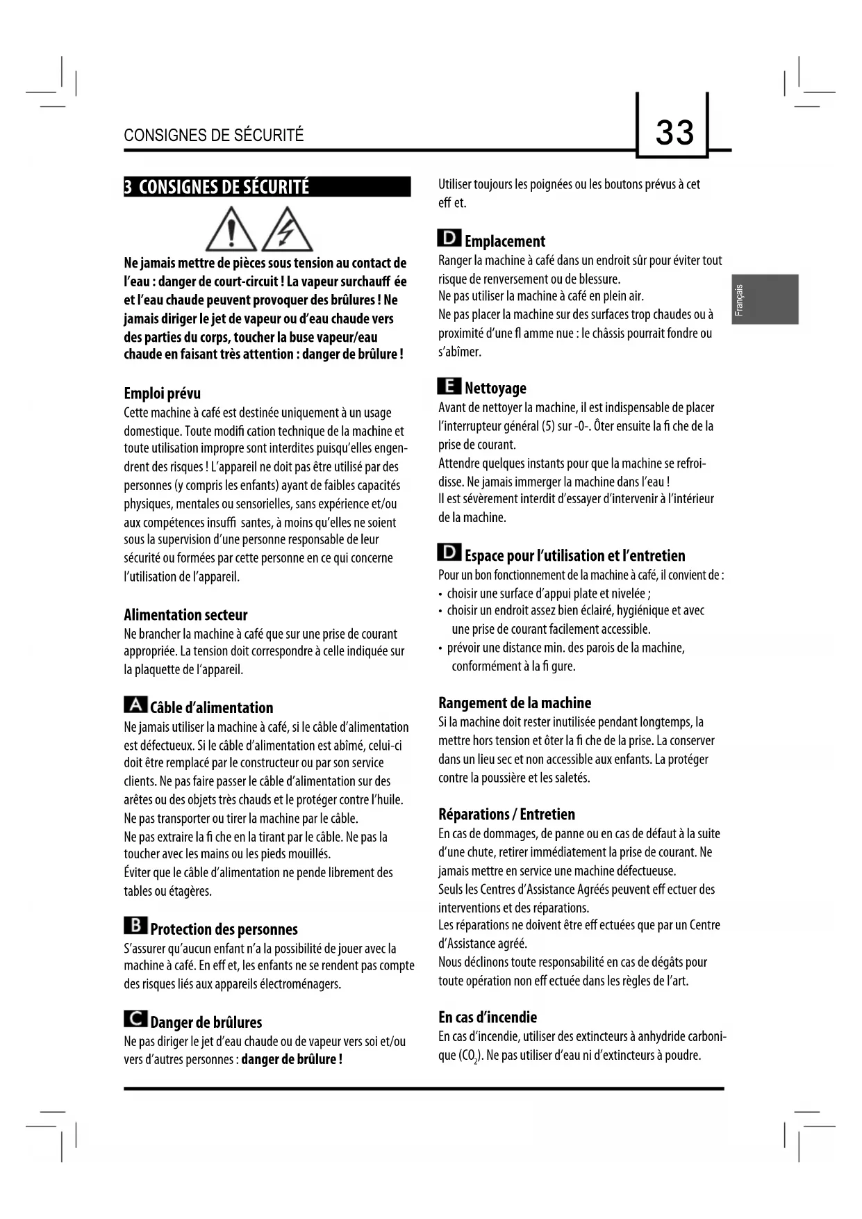 PRÉCAUTIONS Machine est réservée à un usage domestique. Tout entretien, en dehors du nettoyage et de l’entretien usuel par l’usager, doit être fait par un service après-vente autorisé. Ne pas plonger la base dans l’eau. Pour éviter les courts-circuits et les décharges électriques, ne pas démonter la base. Elle ne contient aucune pièce qui demande un entretien de la part de l’usager. Toute réparation doit être effectuée par le personnel d’un service après-vente autorisé. 1 Vérifier si le voltage correspond bien aux spécifi- cations apparaissant sur la plaque des données techniques. 2 Ne jamais mettre de l’eau tiède ou chaude dans le réservoir; mais toujours de l’eau froide. 3 Ne pas toucher les surfaces chaudes de l’appareil pendant le fonctionnement et en écarter le cordon électrique. 4 Ne pas utiliser d’alcool éthylique, de solvants, d’es- sences, de poudre à récurer et/ou d’objets abrasifs pour le nettoyage de la machine 5 Utiliser de l’eau purifiée ou en bouteille pour éviter la formation de tartre.