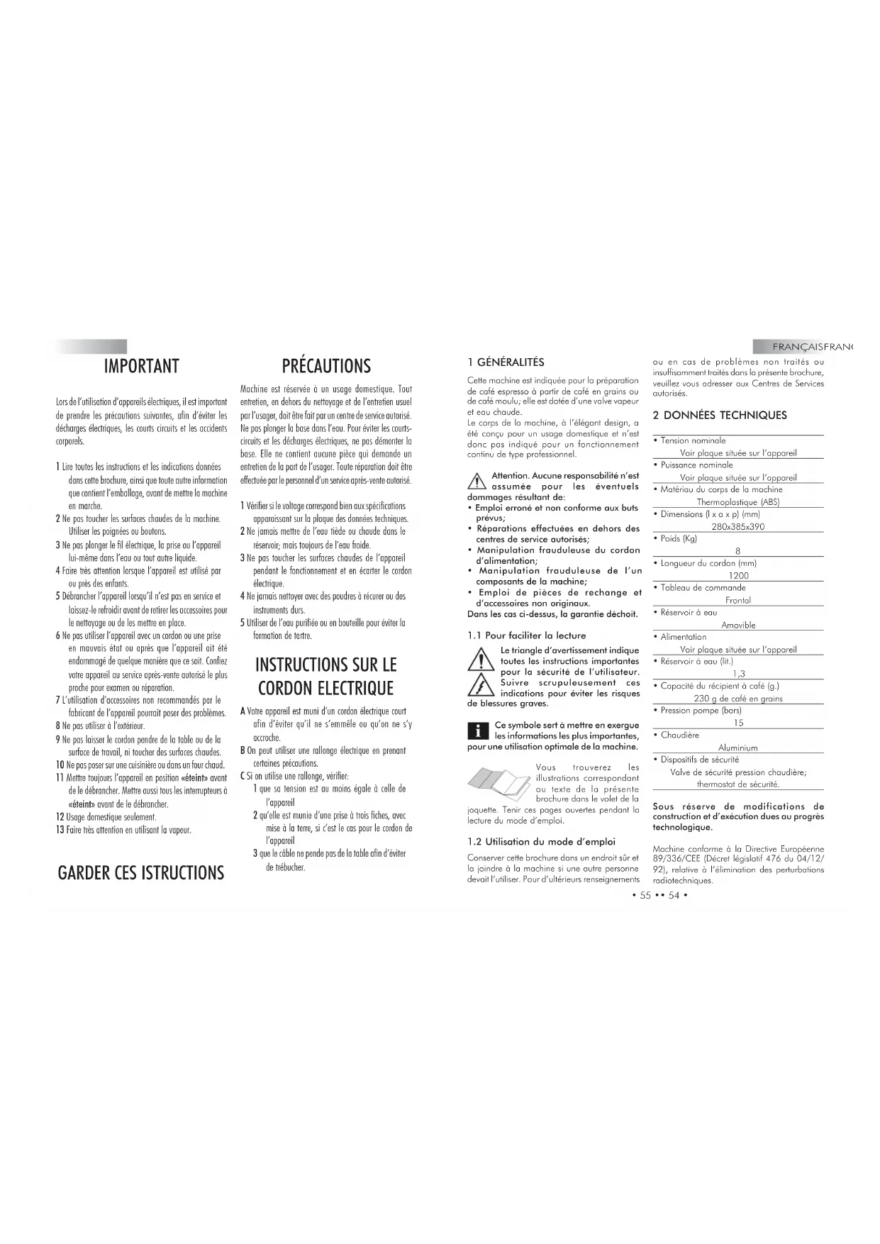 - Dispositifs de sécurité Valve de sécurité pression chaudière; thermostat de sécurité. Sous réserve de modifications de construction et d’exécution dues au progrès technologique. Machine conforme à la Directive Européenne 89/336/CEE (Décret législatif 476 du 04/12/ 92), relative à l’élimination des perturbations radiotechniques.FRANÇAISFRANÇAIS
