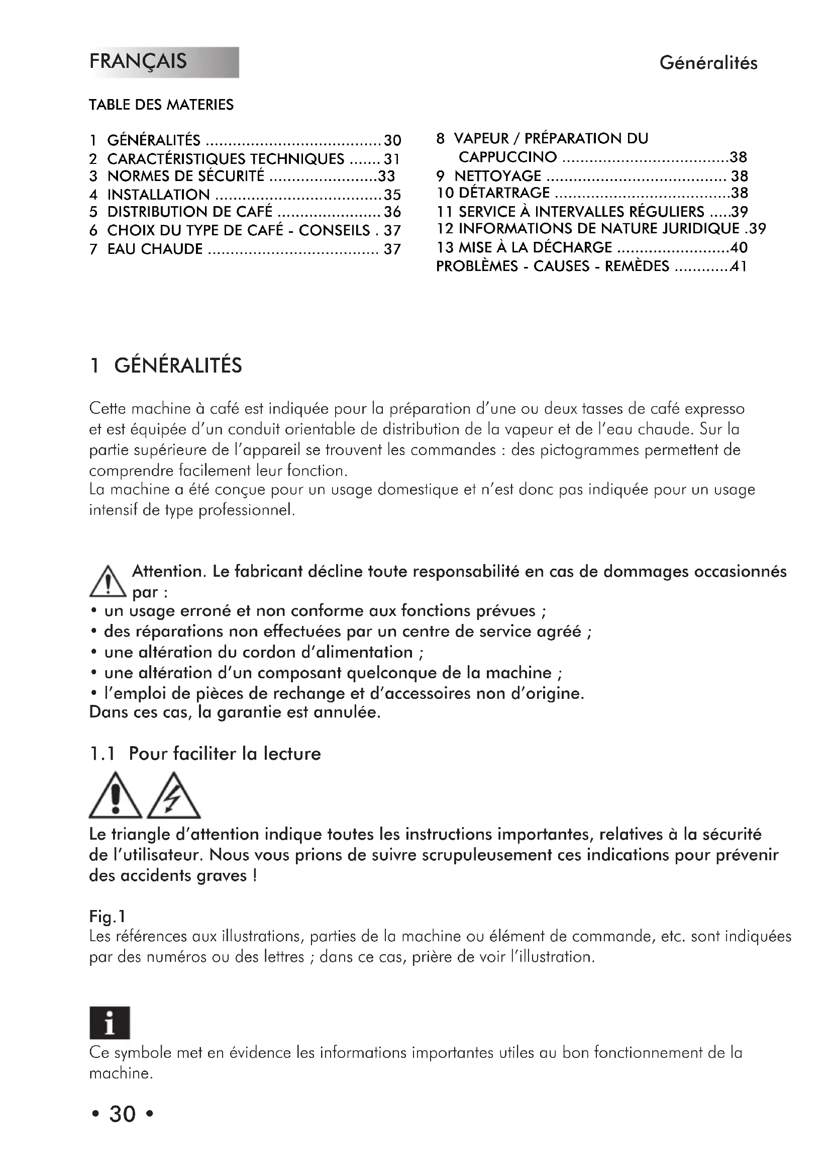 Le triangle d’attention indique toutes les instructions importantes, relatives à la sécurité de l’utilisateur. Nous vous prions de suivre scrupuleusement ces indications pour prévenir des accidents graves ! Fig.1 Les références aux illustrations, parties de la machine ou élément de commande, etc. sont indiquées par des numéros ou des lettres ; dans ce cas, prière de voir l’illustration. Ce symbole met en évidence les informations importantes utiles au bon fonctionnement de la machine. Généralités TABLE DES MATERIES1 GÉNÉRALITÉS ....................................... 2 CARACTÉRISTIQUES TECHNIQUES ....... 3 NORMES DE SÉCURITÉ ........................334 INSTALLATION ..................................... 5 DISTRIBUTION DE CAFÉ ....................... 6 CHOIX DU TYPE DE CAFÉ - CONSEILS . 7 EAU CHAUDE ......................................