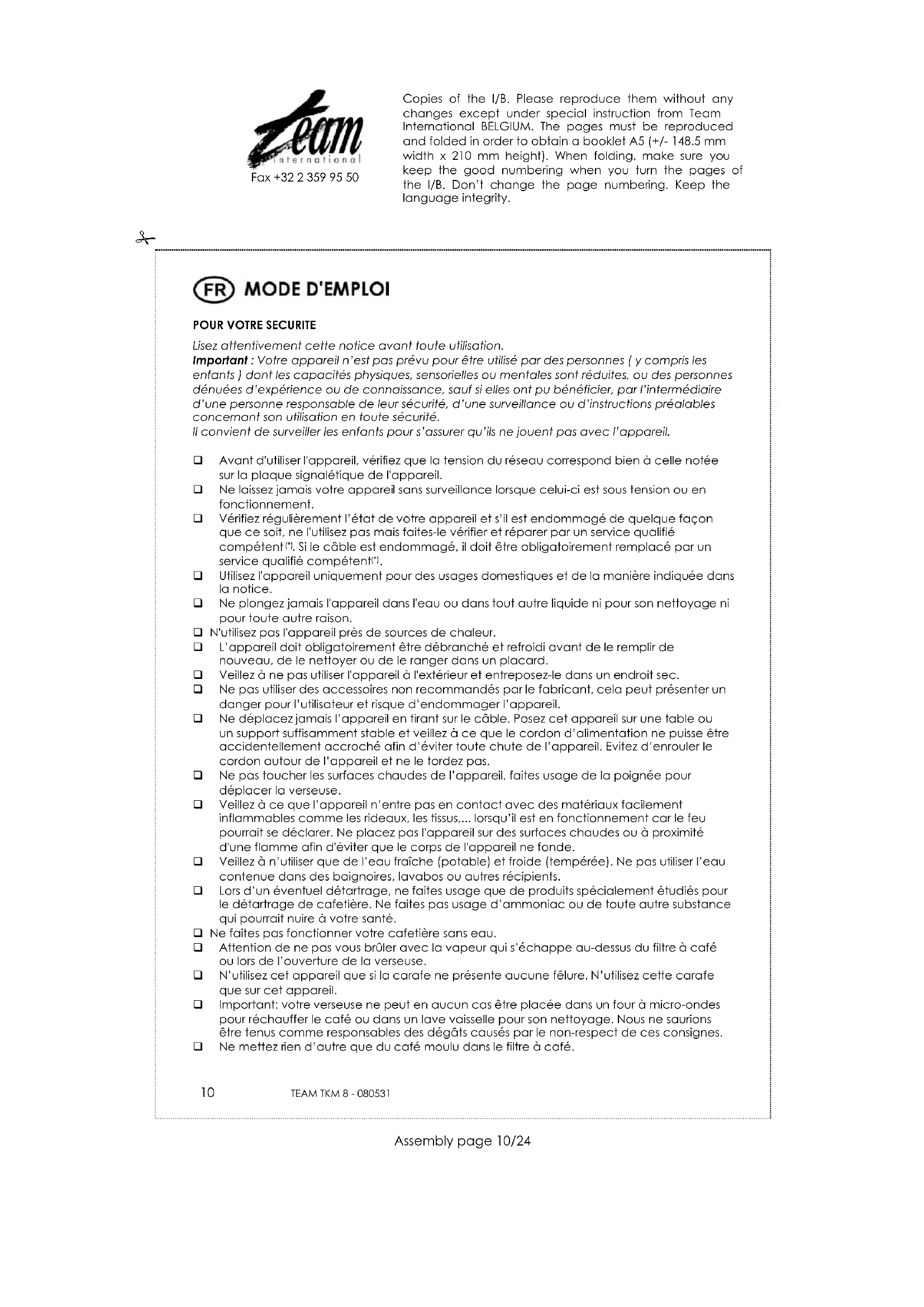 Afin de préserver notre environnement et notre santé, l’élimination en fin de vie des appareils électriques et électroniques doit se faire selon des règles bien précises et nécessite l’implication de chacun, qu’il soit fournisseur ou utilisateur. C’est pour cette raison que votre appareil, tel que le signale le symbole apposé sur sa plaque signalétique ou sur l'emballage, ne doit en aucun cas être jeté dans une poubelle publique ou privée destinée aux ordures ménagères. L'utilisateur a le droit de déposer l'appareil gratuitement dans des lieux publics de collecte procédant à un tri sélectif des déchets pour être soit recyclé, soit réutilisé pour d’autres applications conformément à la directive. Copies of the I/B. Please reproduce them without any changes except under special instruction from Team International BELGIUM. The pages must be reproduced and folded in order to obtain a booklet A5 (+/- 148.5 mm width x 210 mm height). When folding, make sure you keep the good numbering when you turn the pages of the I/B. Don’t change the page numbering. Keep the language integrity.