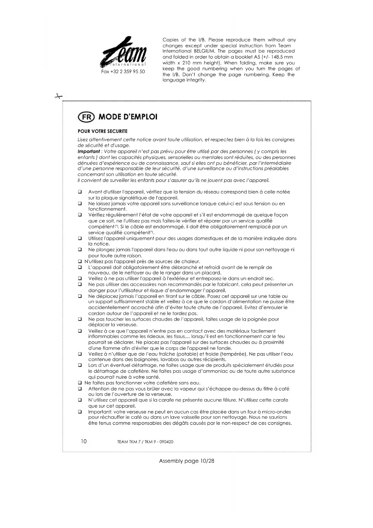 Afin de préserver notre environnement et notre santé, l’élimination en fin de vie des appareils électriques et électroniques doit se faire selon des règles bien précises et nécessite l’implication de chacun, qu’il soit fournisseur ou utilisateur. C’est pour cette raison que votre appareil, tel que le signale le symbole apposé sur sa plaque signalétique ou sur l'emballage, ne doit en aucun cas être jeté dans une poubelle publique ou privée destinée aux ordures ménagères. L'utilisateur a le droit de déposer l'appareil gratuitement dans des lieux publics de collecte procédant à un tri sélectif des déchets pour être soit recyclé, soit réutilisé pour d’autres applications conformément à la directive. Copies of the I/B. Please reproduce them without any changes except under special instruction from Team International BELGIUM. The pages must be reproduced and folded in order to obtain a booklet A5 (+/- 148.5 mm width x 210 mm height). When folding, make sure you keep the good numbering when you turn the pages of the I/B. Don’t change the page numbering. Keep the language integrity.